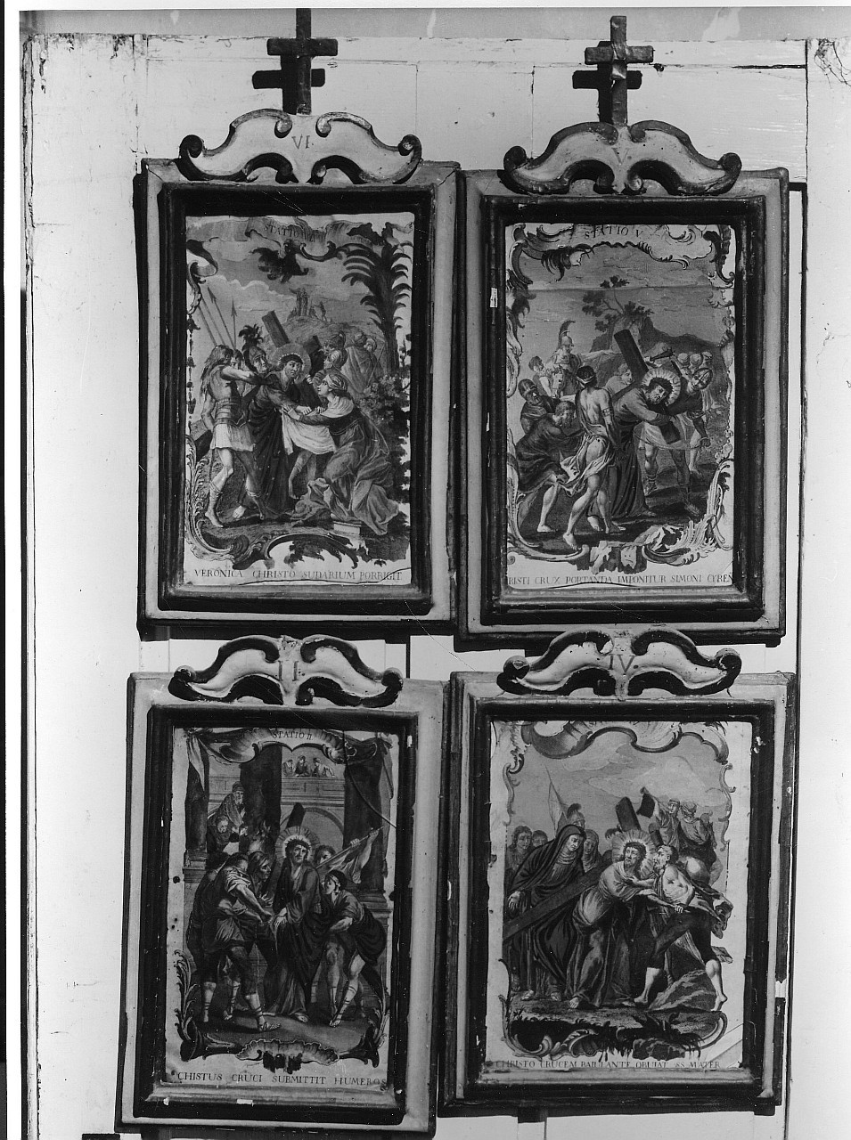 Personaggi: Cristo; Veronica. Figure: soldati; astanti. Oggetti: croce. Decorazioni: cornice con girali vegetali