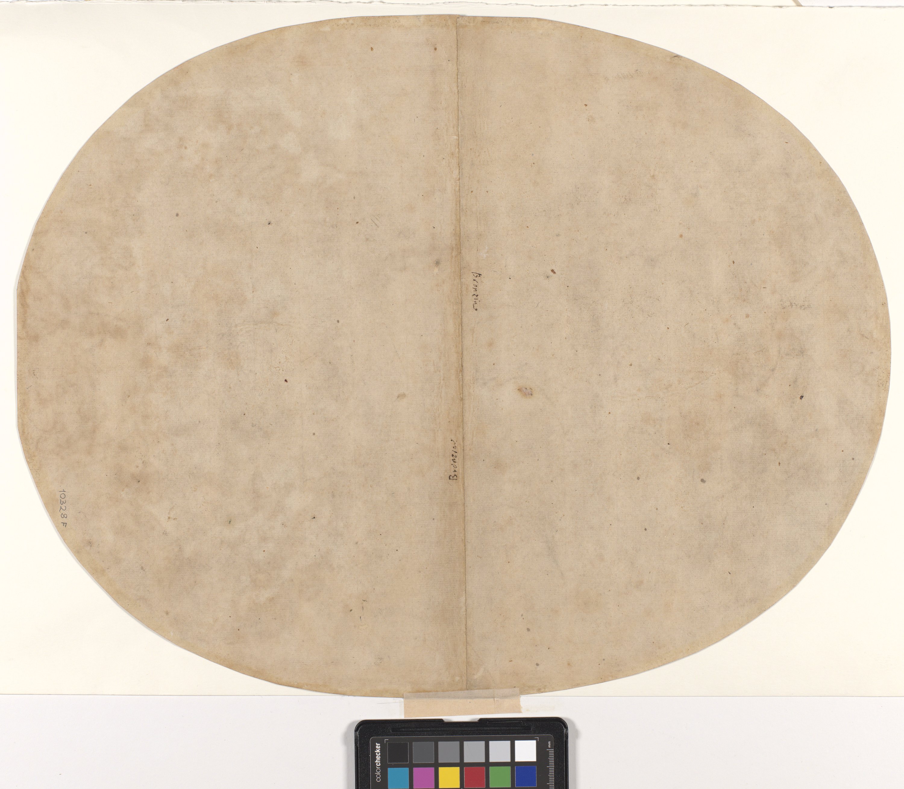 Intorno ad un ovale vuoto al centro, quattro storie della vita della Madonna, di cui le due nei lati lunghi appena accennate e indecifrabili, nei lati brevi a bistro e penna l'Assunzione e l'Incoronazione di Maria contornate da figure di angeli e patriarchi osannanti