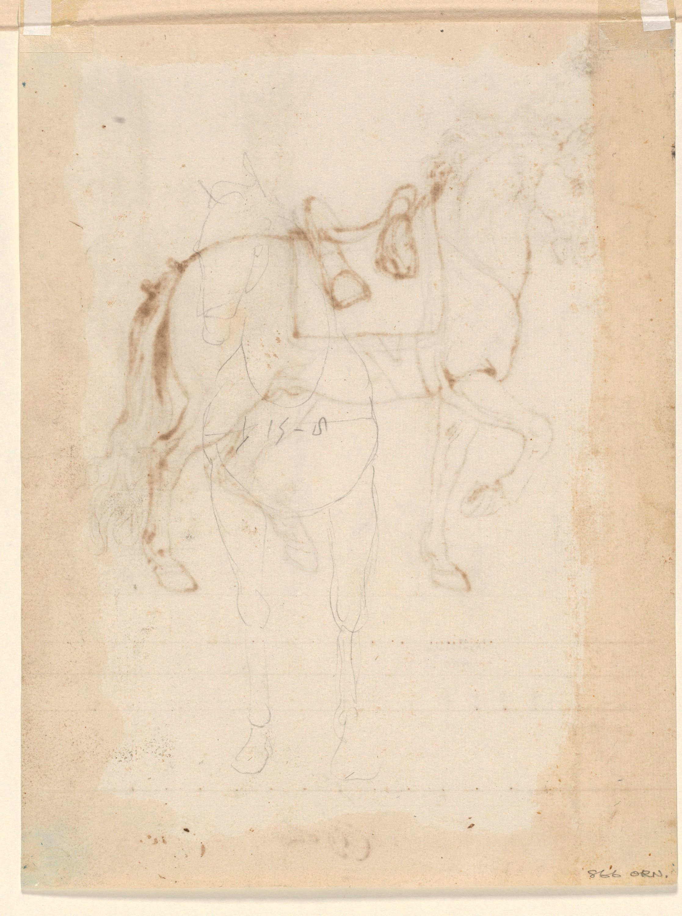- NOTIZIE STORICO CRITICHE Nell'Inventario manoscritto del 1793 conservato agli Uffizi sono citati tre studi per un cavallo sellato, "due a penna ed uno finito e acquarello". Con ogni probabilità questo disegno è da identificare con uno dei due eseguiti a penna, gli altri sono il n. 865 Orn e il n. 867 Orn. Sembra che tutti e tre questi studi siano per il cavallo del monumento equestre di Enrico IV, disegnate dal Cigoli nel 1604 c. (vedi anche i nn. 970 F e 1766 Orn e schede relative)