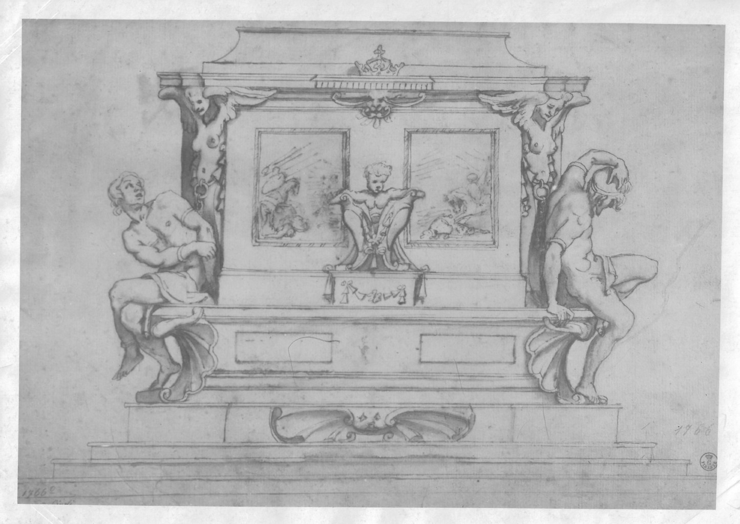 - NOTIZIE STORICO CRITICHE Si tratta di uno studio per la base del monumento equestre di Enrico IV, disegnato dal Cigoli e iniziato dal Giambologna nel 1604 e dopo la sua morte, nel 1608, terminato dal suo allievo Pietro Tacca. Vedi per altre notizie e riferimenti ad altri disegni il n. 970 F e A. Forlani, 1959, n. 79
