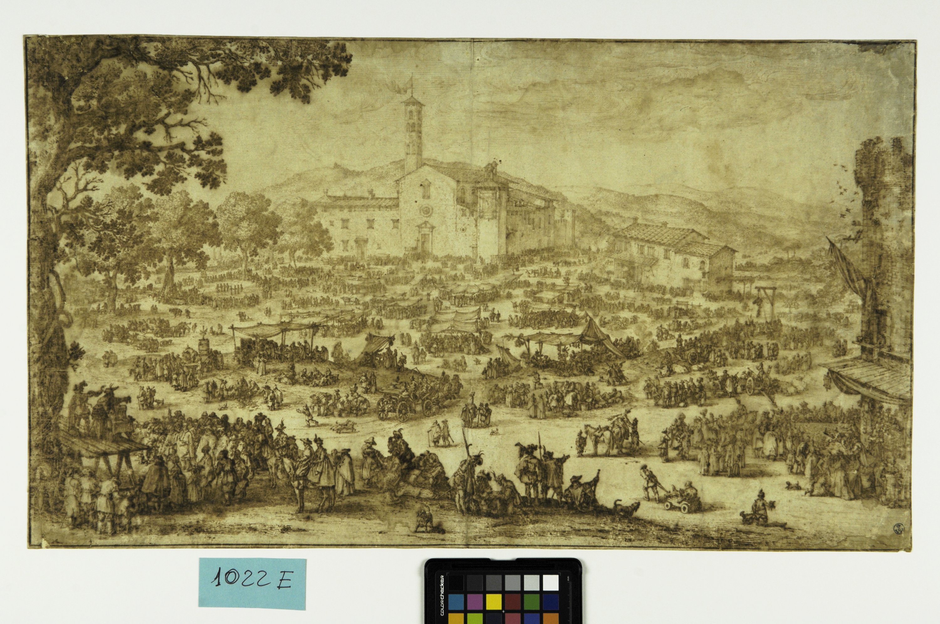 Veduta della piazza dell'Impruneta durante la fiera: la chiesa è in fondo in senso inverso, con davanti vari gruppi di molte figure