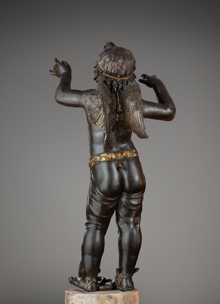 - NOTIZIE STORICO CRITICHE L'opera è rammentata per la prima volta dal Vasari in casa di Agnolo Doni, con l'esatta attribuzione a Donatello e una identificazione con Mercurio fanciullo: viene infatti descritta come "un Mercurio di metallo di Donato, alto un braccio e mezzo, tutto tondo e vestito in un certo modo bizzarro". Ricordato successivamente dal Cinelli nel 1677, sempre in casa Doni, il bronzo veniva ritenuto un’opera antica. Nel Seicento la statua è riconoscibile in quella descritta negli inventari del Palazzo Doni in corso dei Tintori, collocata in salotto sopra il camino e identificata stranamente con Lucifero (Caglioti in Il Ritorno d’Amore); uno dei suoi proprietari seicenteschi, il colto Giovanni Battista Doni, rimase incuriosito dalla strana iconografia del putto e richiese pareri a letterati e antiquari romani, tra i quali Luca Holstenio e Giovan Pietro Bellori. Per la prima volta emerse così l'accostamento con la figura di Attis. Nel XVIII secolo l'allora proprietario, Pietro Bono Doni, decise di vendere la statua che fu acquistata per 600 scudi dalle Gallerie fiorentine e venne esposta agli Uffizi il 25 giugno 1778. Si pose il problema di datare, attribuire e identificare l'opera conosciuta come "Idolo antico"; il Pelli Bencivenni ne diffuse un disegno fra i maggiori studiosi (disegno realizzato da Francesco Marchissi). Il Lanzi, il quale all'epoca soggiornava a Roma, si consultò con vari esperti, fra cui Ennio Quirino Visconti e il Maffei, giungendo dapprima alla conclusione che si trattasse di un'opera antica, una divinità panica, forse Bacco. Successivamente modificò il suo parere orientandosi verso una datazione moderna, per approdare infine ad accogliere l'attribuzione vasariana a Donatello (1782). Tale attribuzione è stata accolta dalla quasi unanimità della critica successiva ed il bronzo è stato datato fra il 1435 e il 1440 per l'affinità con le opere di questi anni, influenzate fortemente dalla conoscenza della scultura antica approfondita nel viaggio romano conclusosi nel 1433. Francesco Caglioti (Il Ritorno d’Amore) circoscrive la datazione al 1436-1438 per confronti stringenti con gli Spiritelli per la cantoria di Luca (ora al Museo Jacquemart André). Il problema più discusso è stato quello dell'identificazione. Ricordiamo alcune delle più significative interpretazioni: Cupido o Mercurio (Muntz); Attys, date le relazioni iconografiche con una statua antica del Louvre (Meier); un faunetto (Venturi). L'identificazione con Attys, figlio di Cibele, è accolta favorevolmente per le analogie iconografiche con la rappresentazione tipica di questa figura (in particolare le lunghe brache che lasciano il sesso scoperto) anche da Beatrice Paolozzi Strozzi (Ritorno Amore). La studiosa tuttavia non scarta l'ipotesi che lo spiritello, figura per metà angelica e per metà demoniaca, racchiuda altri significati. Le capsule di papavero, simbolo del sonno, ma anche figura araldica della famiglia Bartolini Salimbeni, hanno fatto supporre come possibile la committenza da parte di questa famiglia, che tuttavia rimane da definire. Caglioti nota che sicuramente la statua non poté essere commissionata dalla famiglia Doni, che le fonti conosciute indicano come la più antica proprietaria: questo perché all'epoca la famiglia non aveva le possibilità finanziarie per una commissione di così alto livello. Non sappiamo tuttavia come la scultura sia giunta nelle mani dei Doni. Recentemente (2001-2005) è stata sottoposta ad un meticoloso restauro che ha riportato in luce la patinatura antica, le diverse cromie (nelle ali rispetto al corpo) e le lumeggiature in oro. Nel catalogo della recentissima mostra dedicata al maestro, la datazione dell'opera è stata fissata agli anni 1435-1440 circa (cfr. Rowley in Donatello. Il Rinascimento 2022)