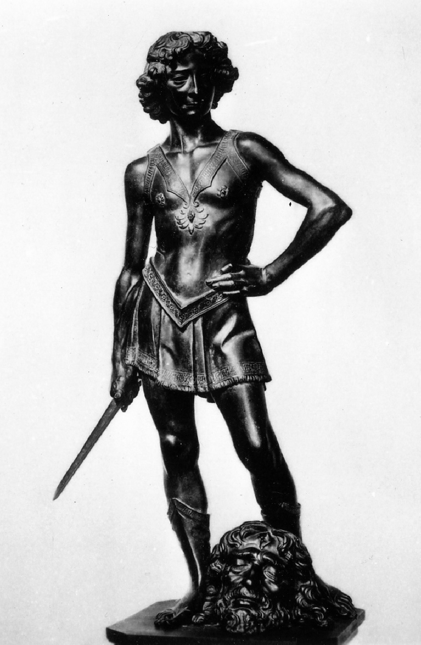 - NOTIZIE STORICO CRITICHE La prima notizia riguardante il David risale al 1476, quando, per centocinquanta fiorini, fu venduto da Lorenzo e Giuliano de’ Medici alla Signoria di Firenze. La scultura doveva essere collocata presso la Porta della Catena all’ingresso della Sala dei Gigli all’interno del palazzo governativo. Nel 1496 compare nell’elenco delle opere eseguite da Verrocchio per i Medici e redatto da Tomaso, fratello dello scultore. Ignota è la storia dell’opera prima di queste date. Vasari la ricorda presso la Porta della Catena ignorando però la committenza medicea. Nel 1495 la statua fu spostata al centro del cortile del palazzo per andare a sostituire quella di analogo soggetto di Donatello, per poi ritornare nella collocazione originaria entro il 1510 e rimanervi fino al 1643 quando fu trasferita agli Uffizi. Il bronzo, separato dal capo mozzo di Golia, fu talvolta identificato con Marte o con un guerriero sconosciuto. Nel 1865 i due pezzi, riconosciuti come pertinenti e quindi riuniti, furono trasferiti al Bargello. Rispetto alla precedente datazione (1473-1475) oggi buona parte della critica è concorde nel datare il David sul finire degli anni Sessanta del Quattrocento; tale precocità sarebbe confermata sia sul piano tecnico, con la scelta di fondere separatamente la statua e la testa di Golia, sia sul piano stilistico come suggerisce il fare ancora un po’ aspro e asciutto che ne palesa l’anteriorità rispetto a prove successive come l’Incredulità di San Tommaso (cfr. Siddi in Verrocchio, il maestro di Leonardo 2019, con bibliografia precedente; Butterfield in Verrocchio: Sculptor and Painter 2019). Butterfield (2019) ricorda che la figura del David, sin dal Medioevo, ha incarnato l'esempio di quel buon governo che garantisce prosperità attraverso il favore divino. Il re biblico, nelle vesti di giovane trionfante, fu quindi adottato nel XV secolo come simbolo di Firenze e della sua capacità di resistere agli attacchi dei potenti aspiranti conquistatori. Il restauro del 2002-2003 ha restituito una migliore lettura dell’opera e la visibilità delle decorazioni in oro, eseguite a missione sui bordi della tunica, dei calzari, in corrispondenza degli occhi e dei capelli (cfr. Il bronzo e l’oro 2003)