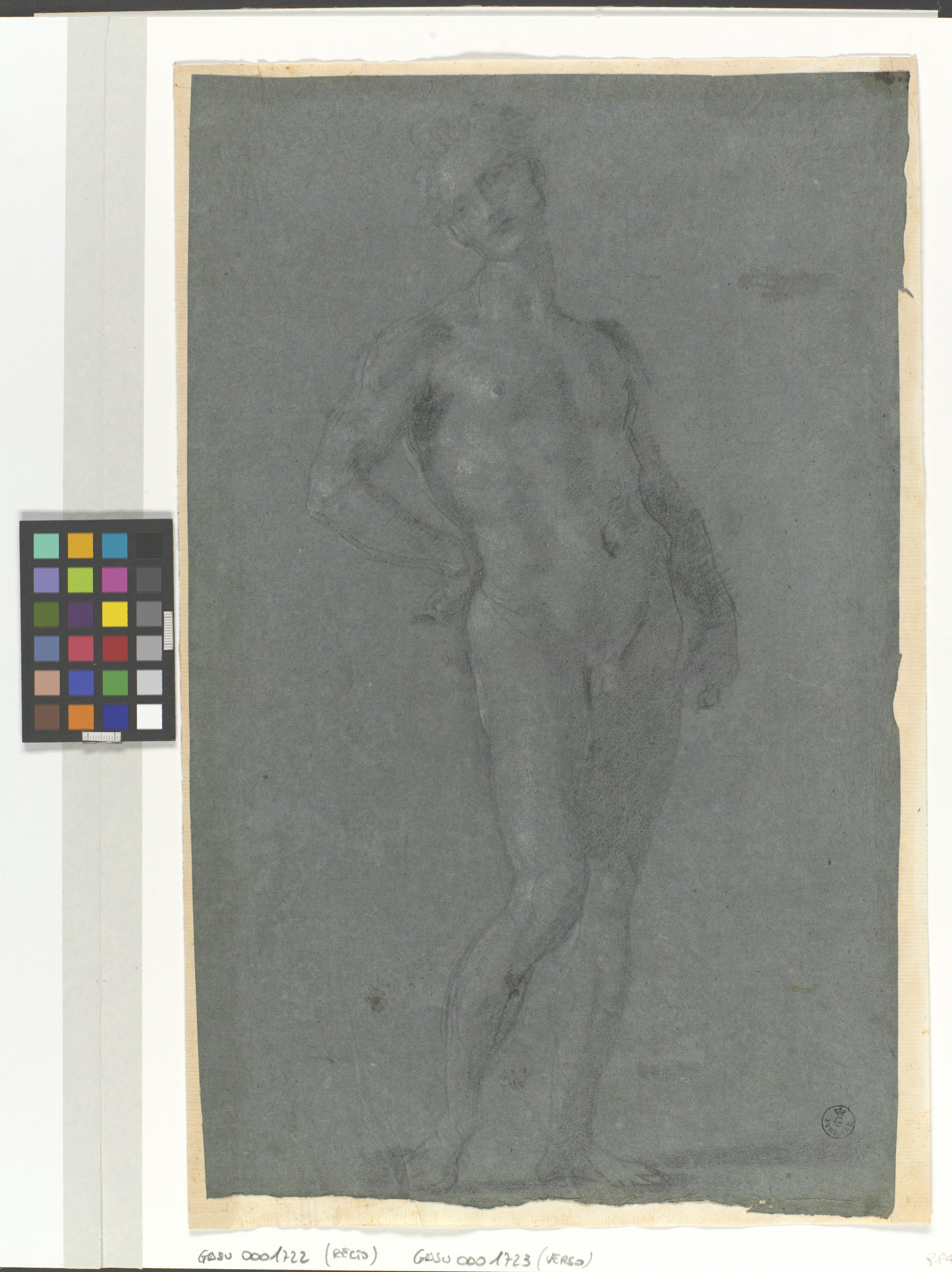 recto: Figura maschile nuda, in piedi vista di fronte, con il busto leggermente piegato a destra e la mano appoggiata al fianco. verso: Figura di vecchio con barba, seduto su una sedia savonarola, visto di profilo verso destra
