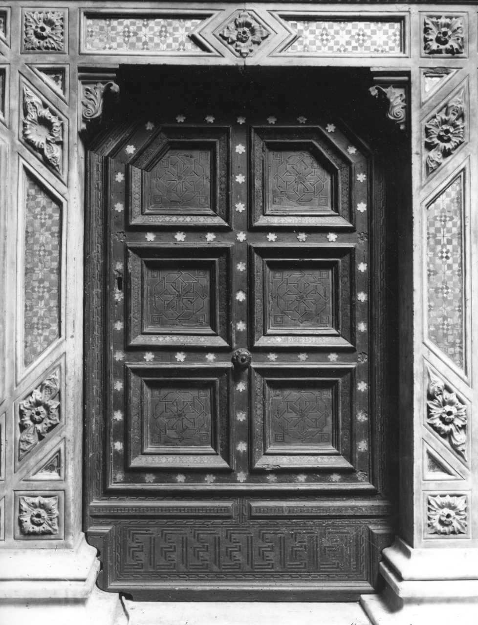 - NOTIZIE STORICO CRITICHE Raffinata porta a intarsio, le cui decorazioni si collegano a quelle del tabernacolo marmoreo dell'Orcagna in cui è inserita. Rash Fabbri e Rutenburg notano che le sue piccole dimensioni limitavano l'accesso ai soli menbri della Compagnia, i quali, costretti inoltre ad inchinarsi per entrare, si occupavano del culto all'interno del tabernacolo. La difficoltà di ingresso è giustificabile se si considerava poi che la loggia ancora aperta era frequentata intensamente da mercanti ed il tabernacolo aveva bisogno quindi di una forma di protezione e isolamento