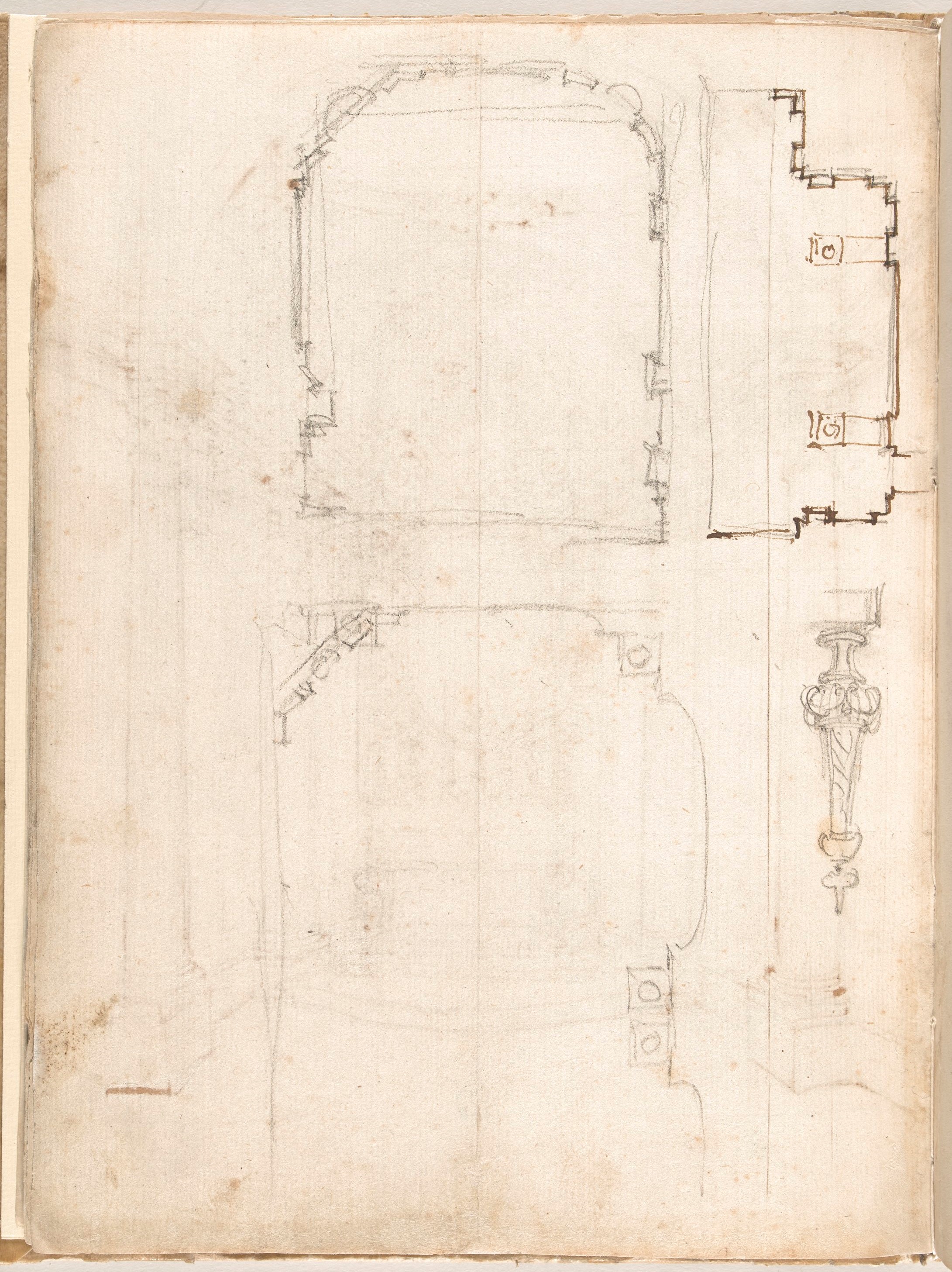 recto: Interno di cappella a cupola con pareti decorate con semicolonne, altare con tavola ovale ornata. verso: Due piante di cappella quadrangolare, e sulla destra del foglio uno schizzo di gamba di tavolo