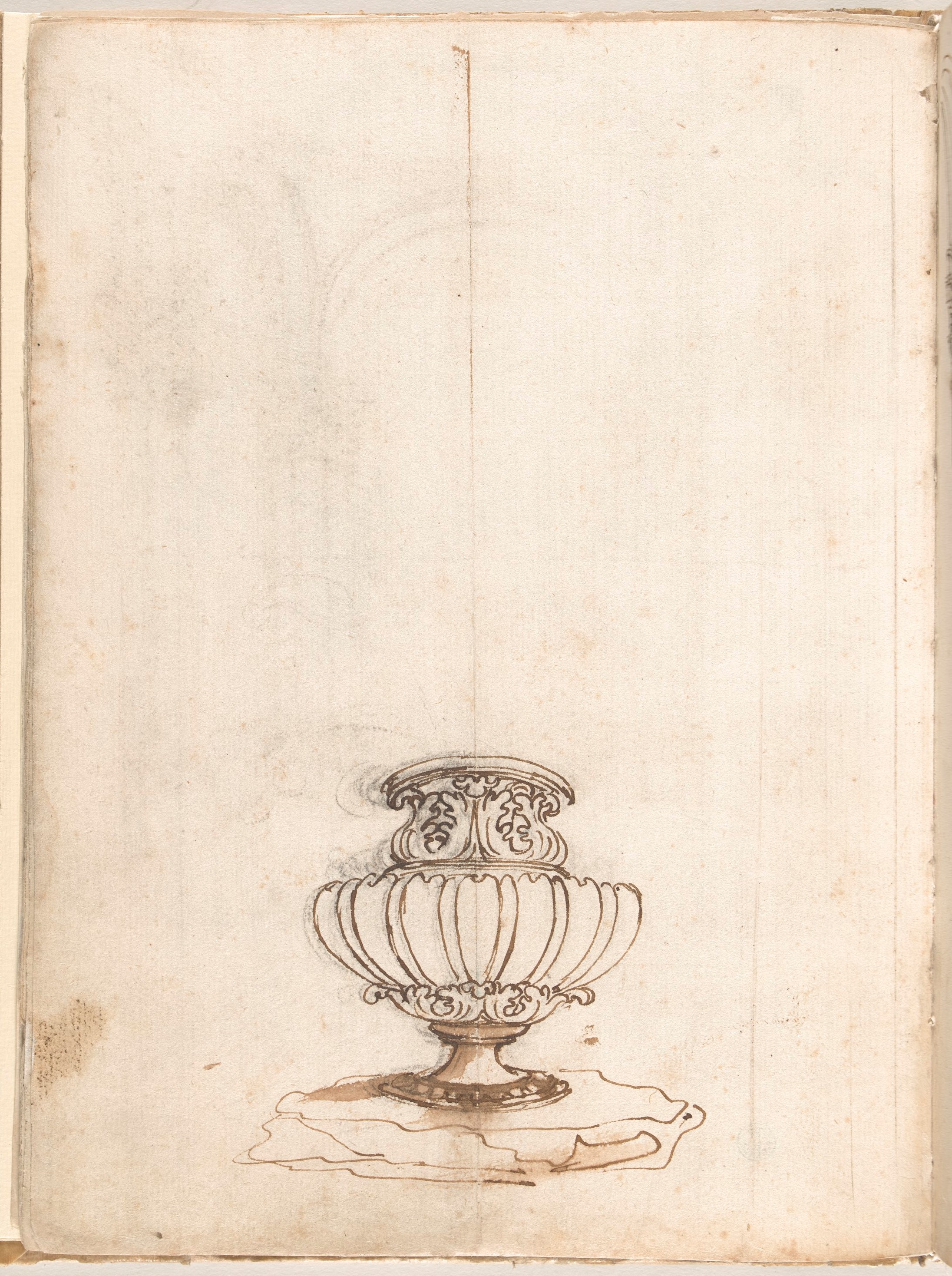 recto: Interno di cappella con cupola, sorretta da colonne con capitello e sopra archi; al centro un vaso appena abbozzato. verso: Vaso panciuto su piede circolare con baccellatura sul corpo e foglie di acanto sul collo rialzato
