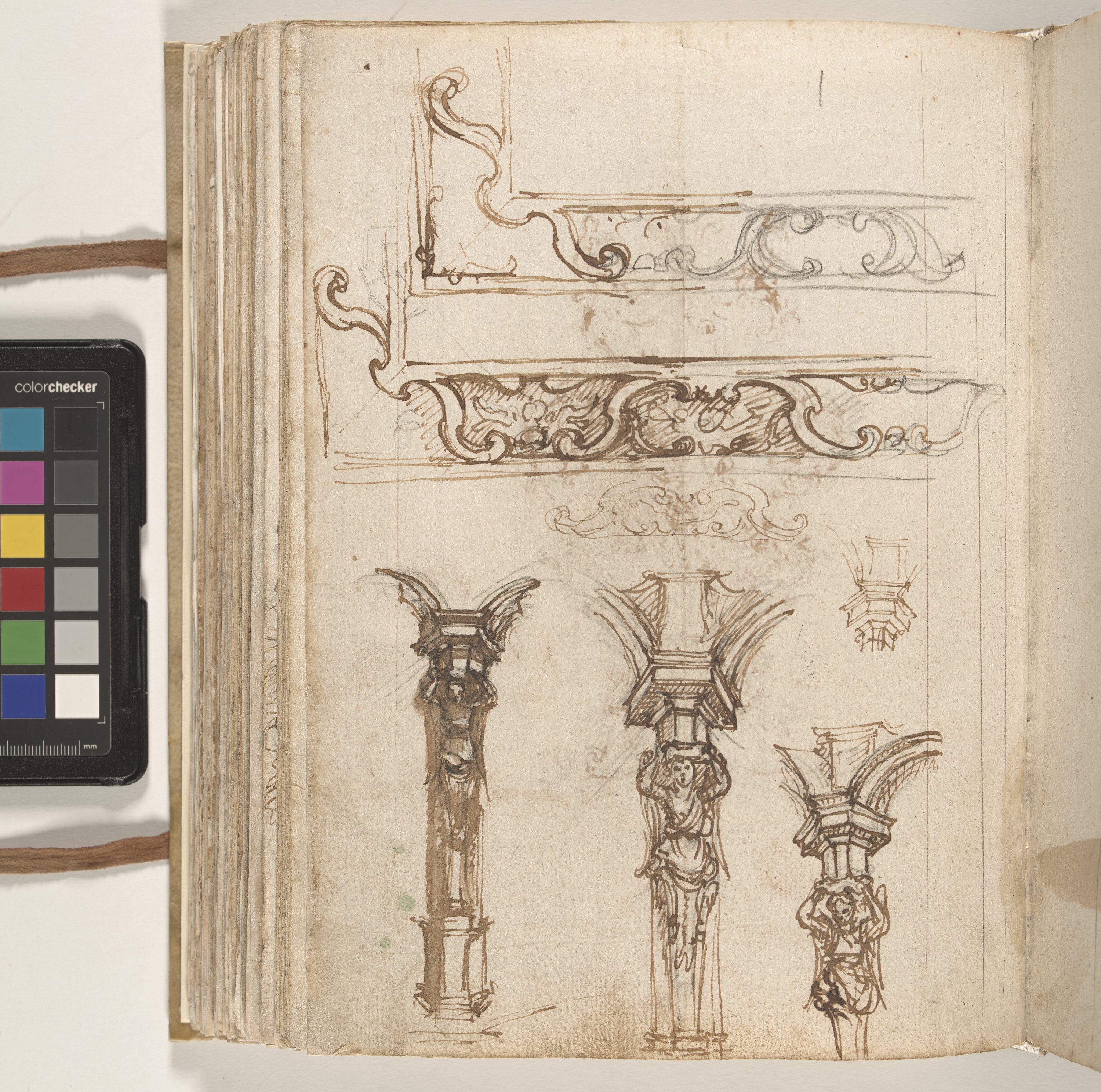 recto: Studio di reliquiario a forma espansa ornato da racemi fogliati e statuette di santi. verso: Due studi di cornice a volute; nella parte bassa del foglio particolari architettonici angolari con cariatidi di reliquiario