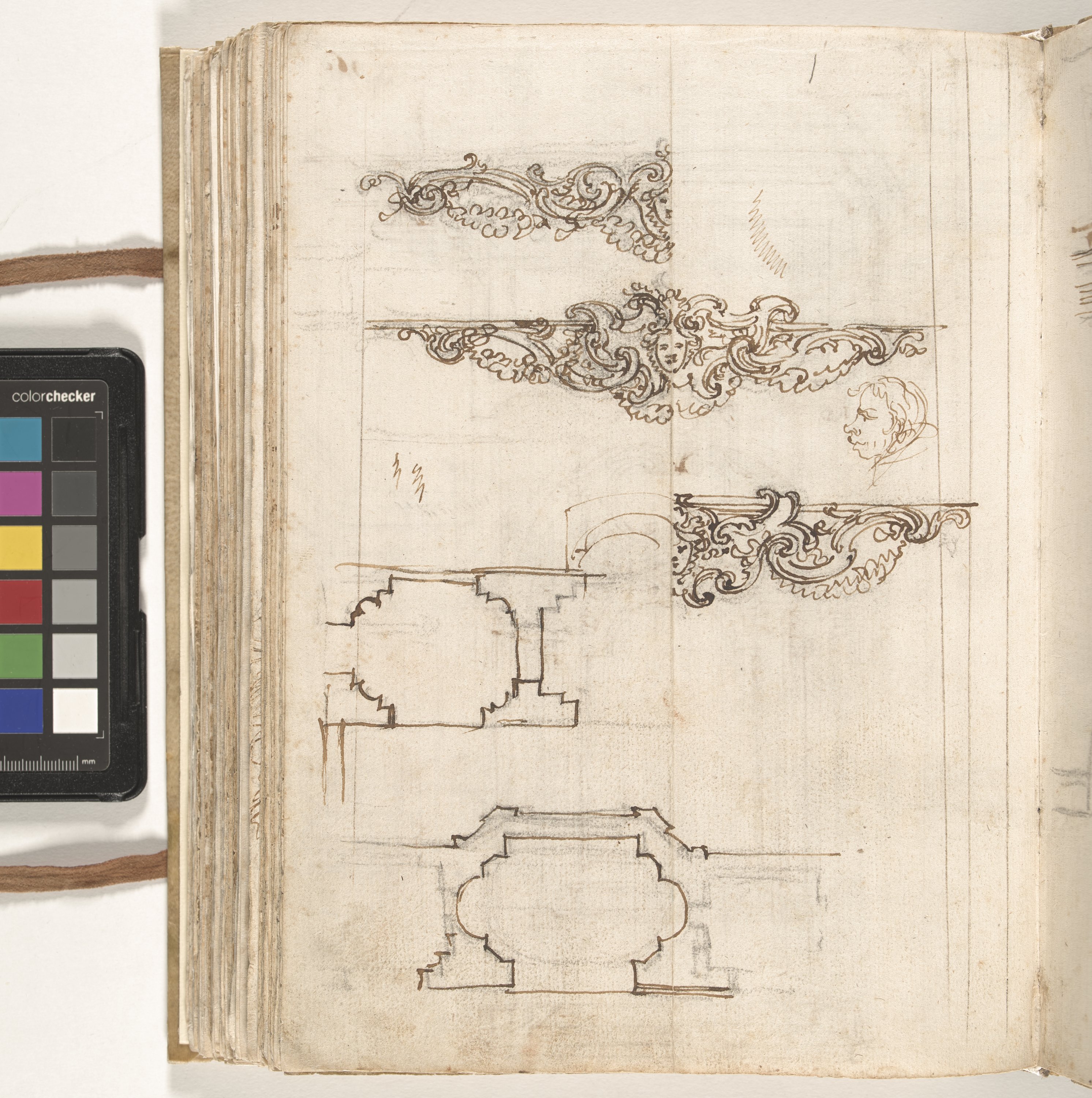 recto: Studio di cappella con tavola d' altare e frontone complesso, decorato da volute formanti un cartiglio; al di sopra del foglio studio di architrave con mensole a volute. verso: Studi di piante e di tre ornamenti formati da testina femminile tra volute; a destra del foglio testa maschile vista di profilo