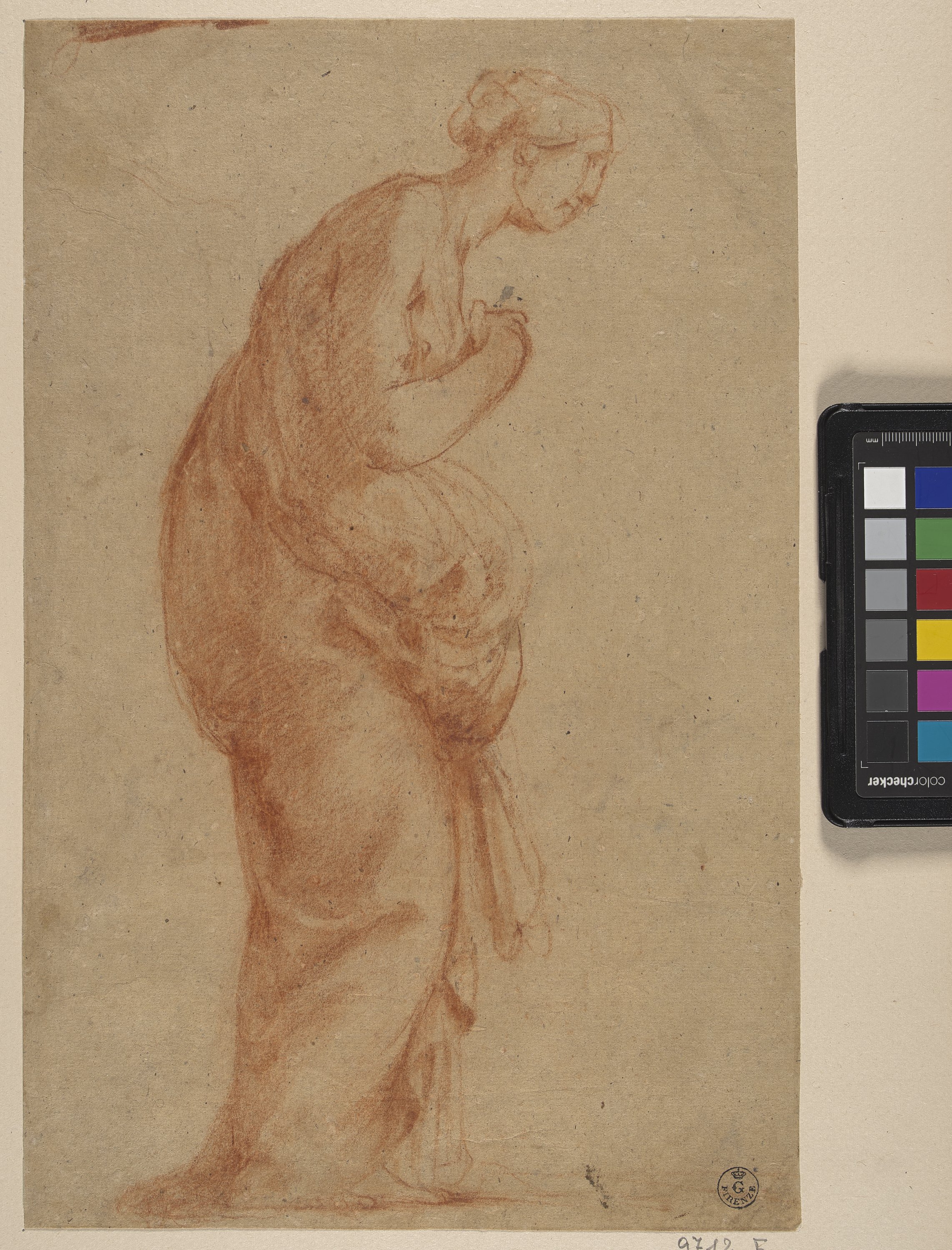 - NOTIZIE STORICO CRITICHE Questo disegno preparatorio per gli affreschi della Sala degli Argenti (oggi Museo del Tesoro dei Granduchi), precisamente la prima musa a sinistra dell'episodio di "Lorenzo il Magnifico accoglie Apollo con le MUse", eseguiti dal Montelatici tra il settembre del 1638 e quello successivo del 1639. Il disegno portava l'attibuzione tradizionale al Furini, attribuzione che non può essere assolutamente accettata perchè il disegno presenta il segno veloce e nervoso della mano di Cecco Bravo. Del resto ciò era stato giustamente rilevato dal Ferri con una scritta autografa sul controfondo. La Masetti (1962) contesta questa attribuzione affermando che "... giustamente invece di questo artista (Furini) il n. 9712"