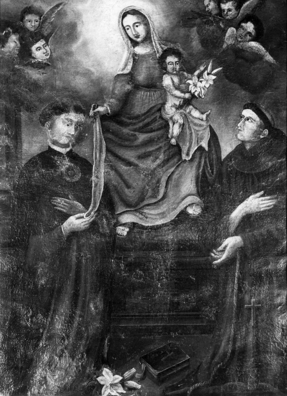 Soggetti sacri. Personaggi: Madonna; Gesù Bambino; San Niccolao; Sant'Antonio da Padova. Attributi: (San Niccolao) scapolare; (Sant'Antonio da Padova) giglio