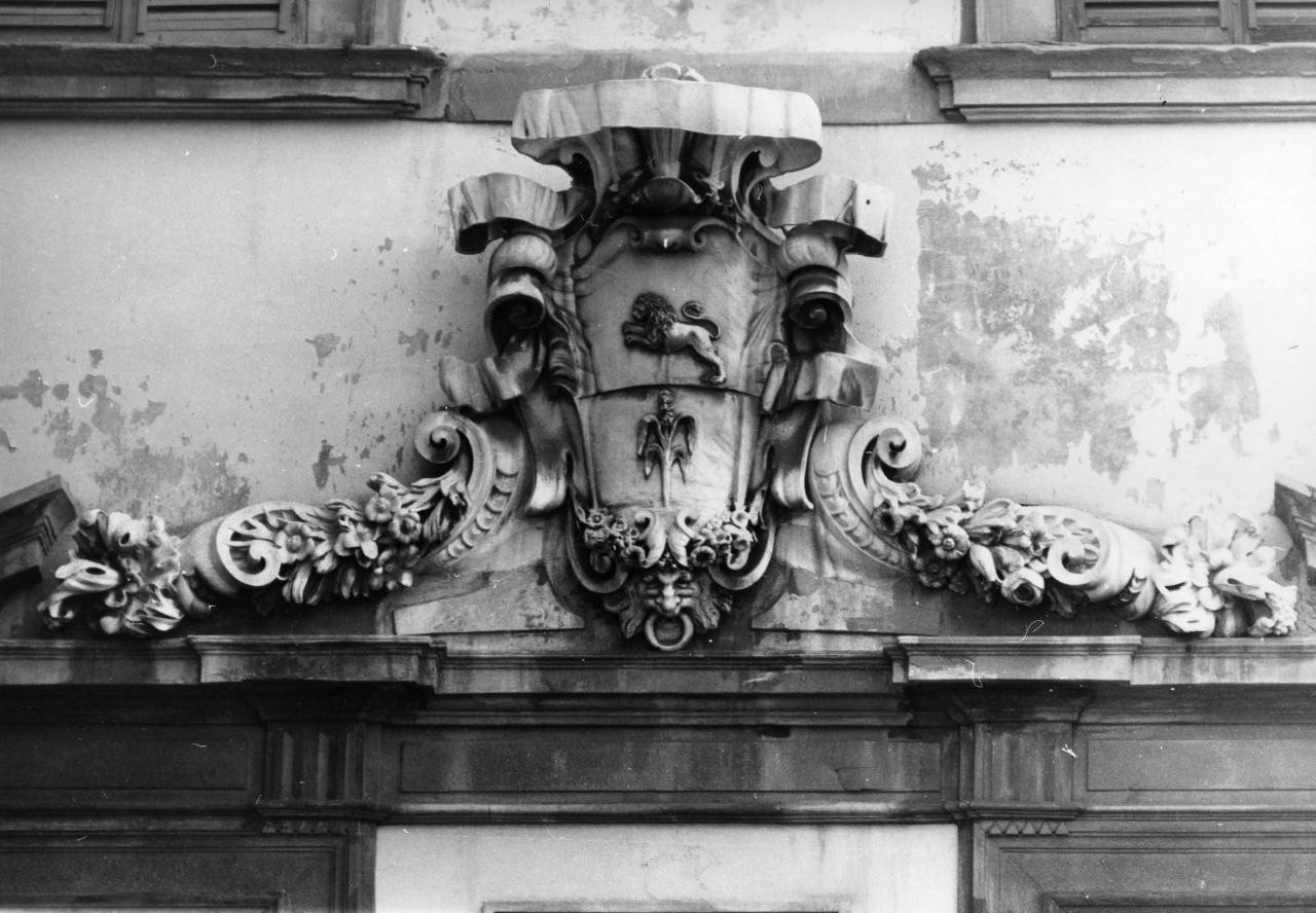 Lo stemma fa parte di complesso decorativo unico costituente il fastigio della finestra del piano nobile. Incorniciatura a volute e cartigli intrecciati con festoni di fiori