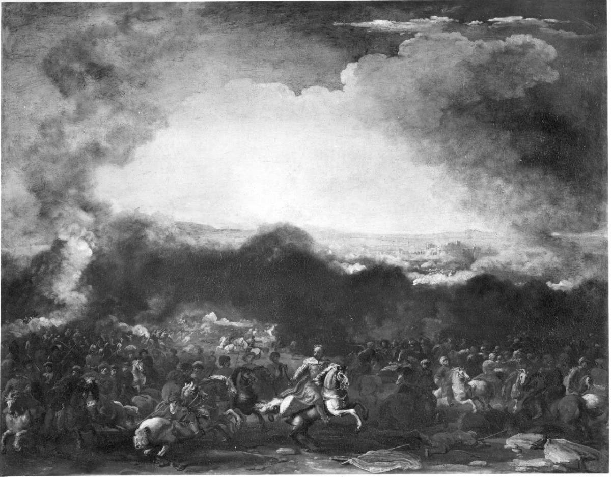 - NOTIZIE STORICO CRITICHE Del quadro si ignora la provenienza e lo troviamo citato negli inventari ottocenteschi come maniera del Borgognone. Nel catalogo della mostra del 1989 il dipinto è attribuito al battaglista riconoscendone il senso cromatico e atmosferico delle nubi e dei fumi, la pennellata sciolta e la vivacità delle figure. Si suppone che si tratti di un'opera dell'ultimo periodo del Borgognone, realizzata forse durante l'ultimo soggiorno in Toscana, nel 1675, quando realizzò per il granduca Cosimo III l'autoritratto, che in realtà presenta strette analogie stilistiche con il dipinto in esame. Nel primo piano, sullo sfondo di un vasto orizzonte sono rappresentati un condottiero turco a cavallo che sembra raccogliere intorno a sé le truppe per la battaglia