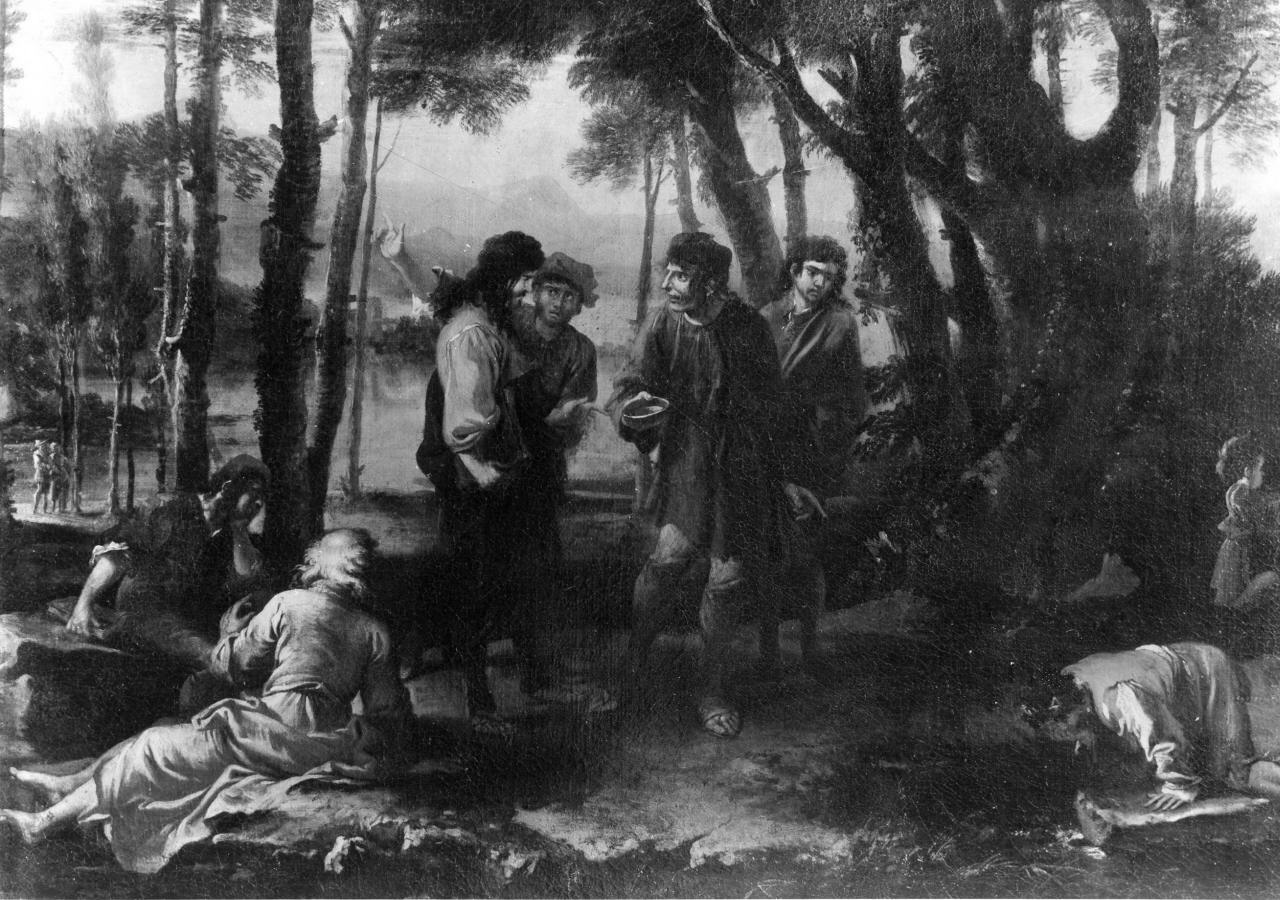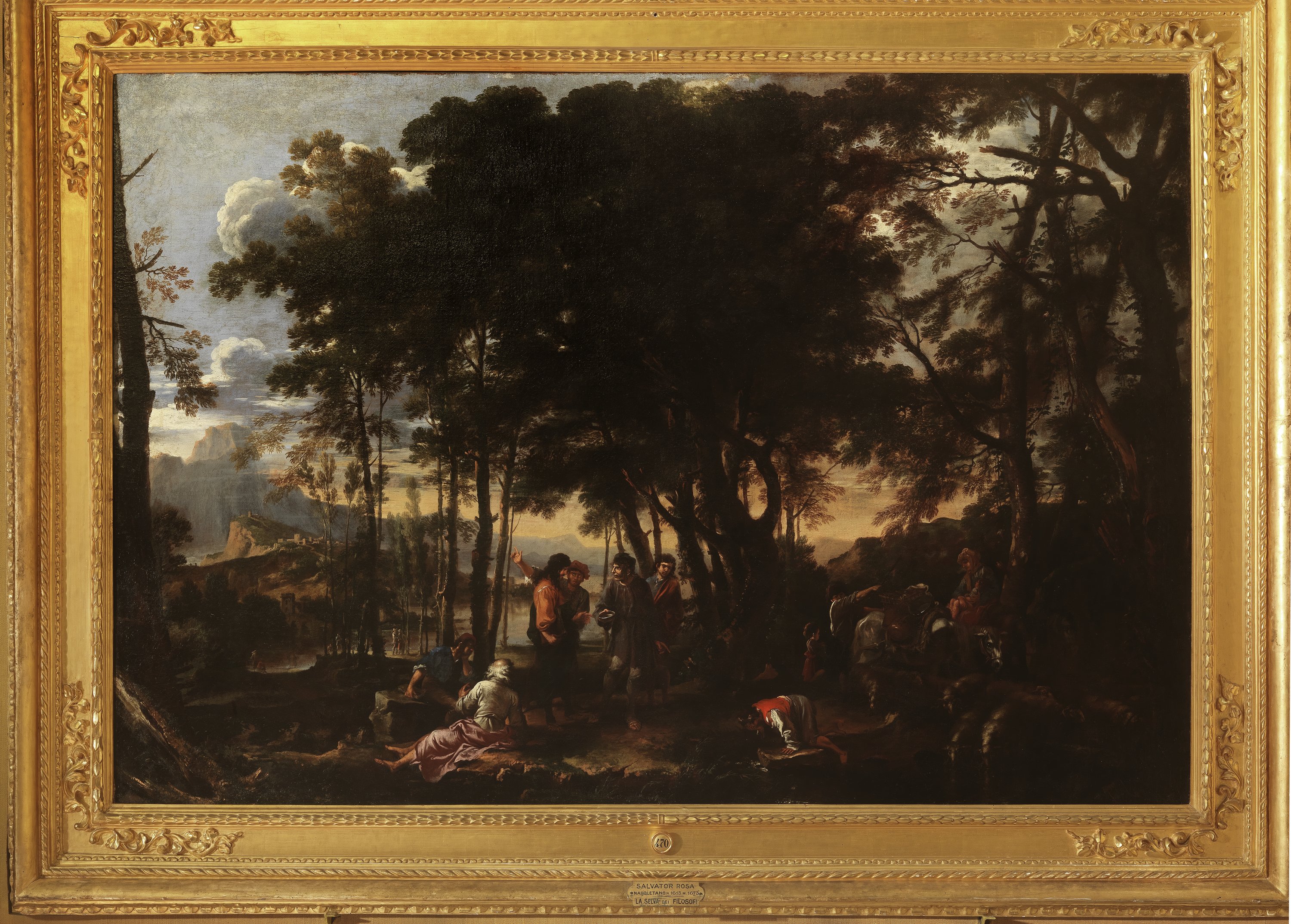 - NOTIZIE STORICO CRITICHE Il quadro è tratto da una lettera apocrifa di Diogene a Krates. Secondo Ba ldinucci il quadro fu dipinto per Carlo Gerini, nella cui collezione è inf atti citato da Bocchi- Cinelli nel 1677. Nel 1818 il quadro fu acquistato da Ferdinando III insieme ad altri quadri della collezione Gerini e fu esp osto nella Galleria Palatina. Questo soggetto è uno dei favoriti del Rosa: scene come la vita di antichi filosofi, che implicano una critica alla vi ta corrotta della città, ricorrono frequentemente nei suoi quadri. Vi sono molti paralleli con la poesia satirica di Rosa. H. Langdon vede nella "Se lva dei Filosofi" l'influenza dei paesaggi veneziani e rapporti con gli sv iluppi della pittura romana: ciò suggerisce una data precedente al periodo fiorentino del Rosa. Che il quadro fosse dipinto nella prima metà del 164 0, dice H. LAngdon, "...è anche confermato dalle figure che, benchè in for ma classica, sono ancora modellate sul genere dei Bamboccianti (...) Una r elativa data precedente al periodo fiorentino del Rosa è anche supportata dallo stile del dipinto 'compagno'. Salerno (1973, pp. 827- 828) sostiene invece che il quadro fu dipinto tre il 1648 e il 1649 perchè le figure non sono più 'bambocciate' ma originali