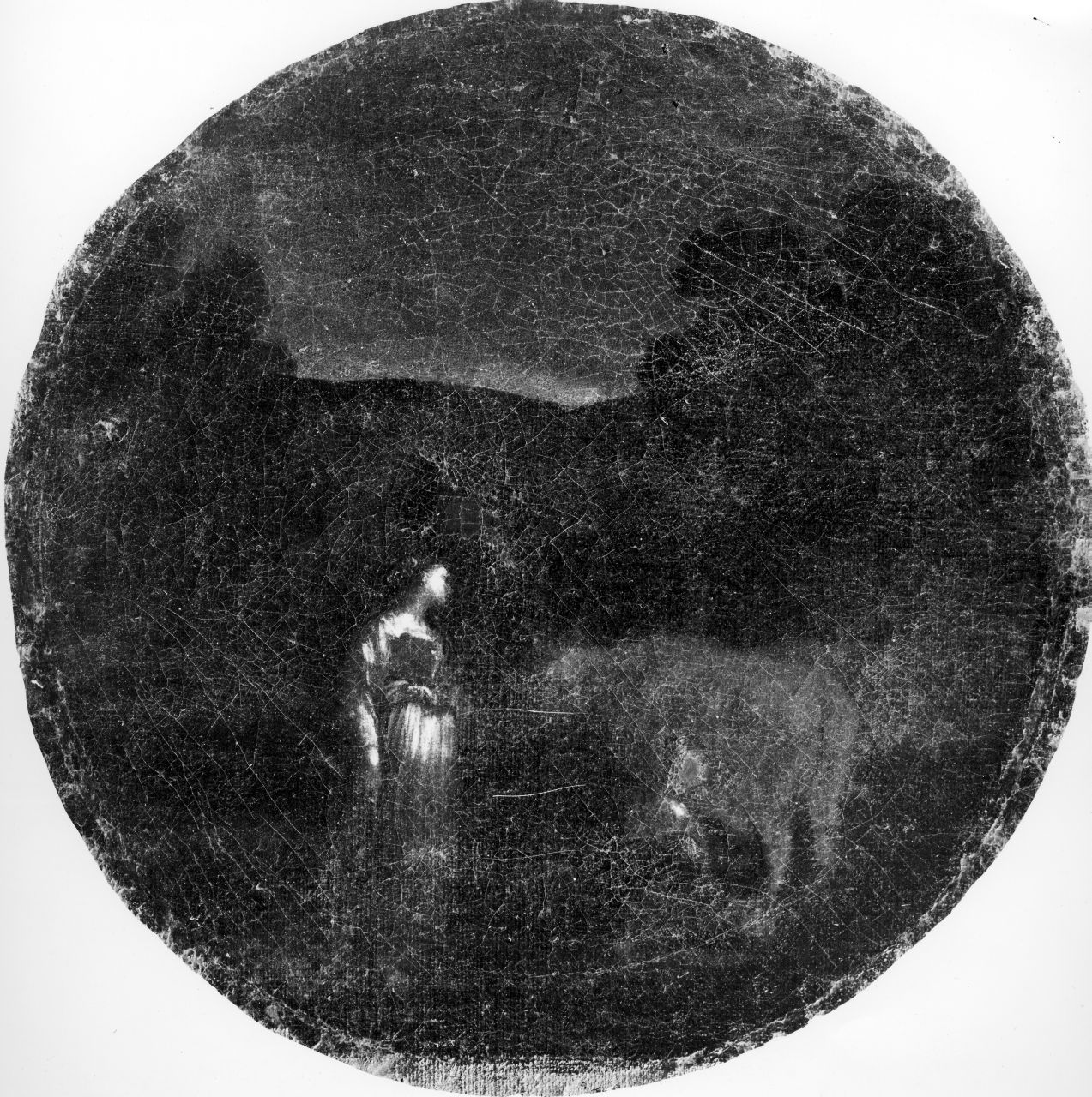 - NOTIZIE STORICO CRITICHE L'opera è certamente una delle tante "d'argomento per lo più piacevoli e volgari" (G.P. Zanotti, "Storia dell'Accademia Clementina di Bologna", 1739, p. 51), che il Crespi dipinse per il Gran Principe Ferdinando. L'Arcangeli (1970, p. 260), pur ammettendo la possibilità che il dipinto appartenga agli anni del rapporto con Ferdinando, ha suggerito una datazione intorno al 1715, per ragioni di affinità stilistica con la produzione del pittore di quel periodo. Si è potuto invece accertare che il dipinto era nella collezione particolare del Principe, dato che compare nell'inventario della sua eredità (ASF, Guard., 1222, c. 40r, s.n.), dove è così descritto:"quadro in tela di forma tonda, alto e largo s. 14, dipintovi dentro di Giuseppe Crespi detto lo Spagnolo, una femmina in piedi con pertica in mano, et altra simile, che munge una vacca, con veduta di paese, e montagne...". Anzi dobbiamo retrocedere la sua esecuzione entro il 1710, giacchè il quadro compare in un inventario non datato (ASF, Guard. 1185, IV, c. 1324, n. 576), ma da ascriversi secondo Bagnoli tra il 1708 e il 1709 (cfr. "G. Maria Crespi...", 1993, p. 78, n.9)