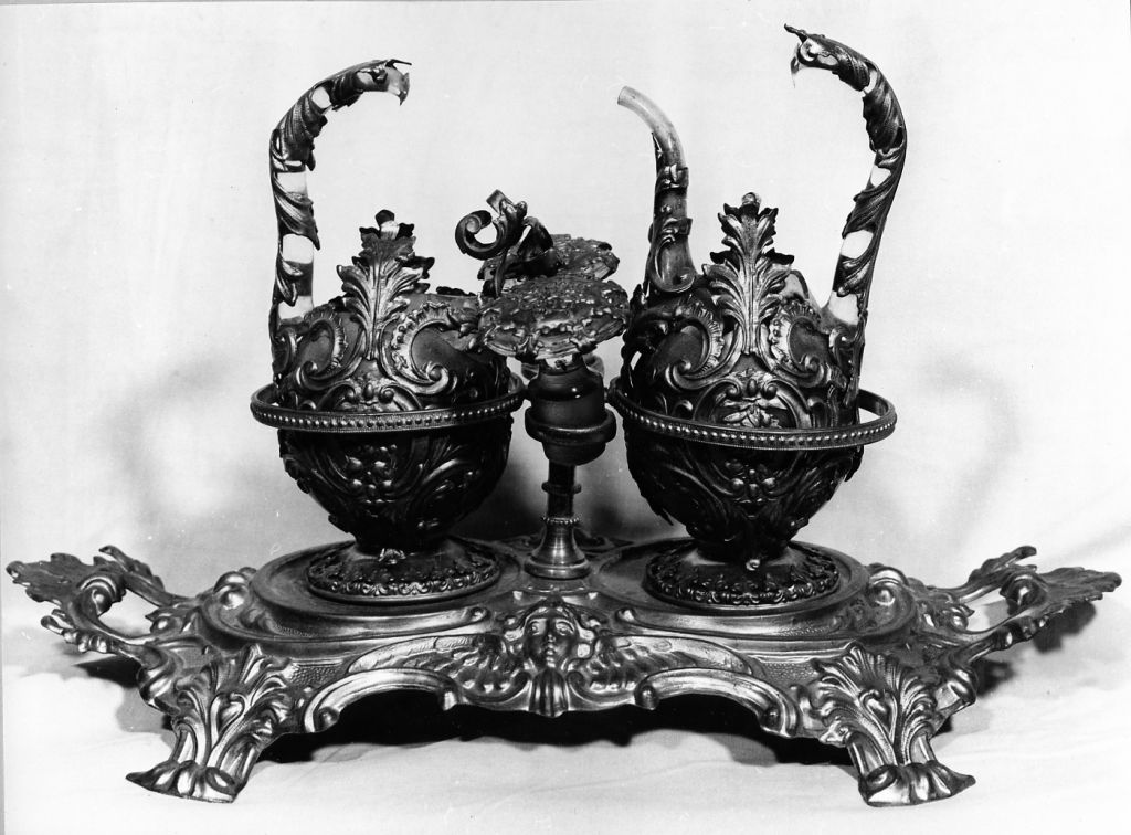 Il supporto poggia su quattro piedi a riccio, ed è dotato di due manici a volute foliate. La sua superficie è decorata con altre volute a foglia e da un cherubino al centro. Sul supporto sono posti due ampolle in vetro avvolte in un'armatura metallica. Le ampolle hanno la base a sezione circolare con fascia decorativa a gigli stilizzati. Il resto dell'armatura ha decori a volute foliate. Al centro tra le ampolle i due coperchi in vetro con testa rivestita in metallo a decori floreali