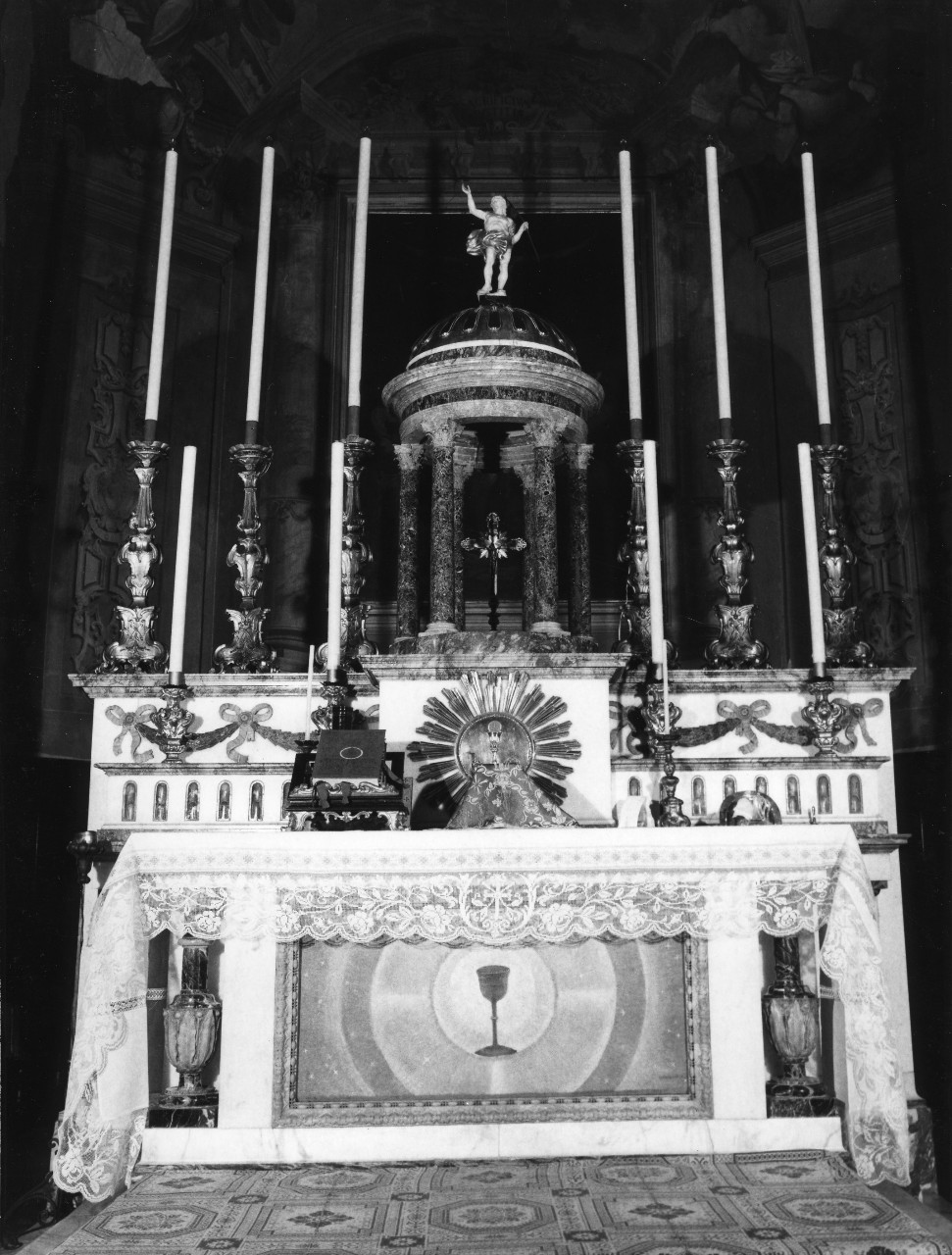 Altare in marmo bianco ornato di sgusci e festoni in marmo maranto venato; le cornici superiori sono in giallo di Siena; l'esedra presenta pilastri in marmo verde venato e cupola in giallo; il coronamento è rappresentato da una figuretta in marmo bianco del Cristo Redentore; la mensa è sostenuta da pilastri a vaso in verde con fogliami in giallo di Siena. Il paliotto è moderno
