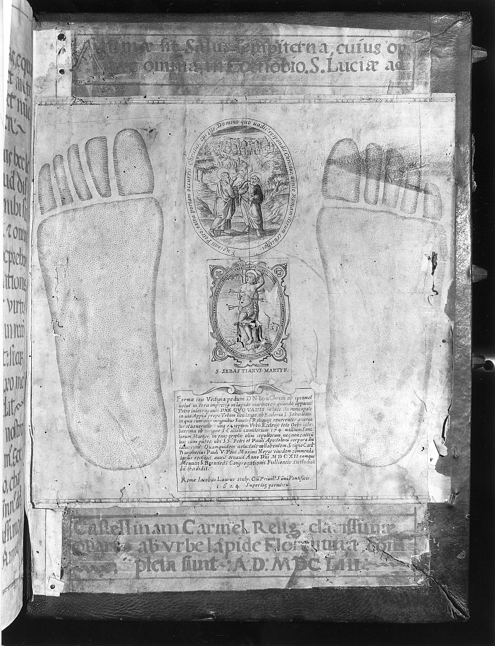 - NOTIZIE STORICO CRITICHE Incisione a bulino raffigurante le impronte dei piedi di Gesùcome sono state impresse su una lapide marmorea, con due ovali che chiariscono l'occasione ed il luogo del miracolo. Come spiega la lunga iscrizione esso avvenne al momento della fuga da Roma di Pietro (raffigurata nell'episodio del "Quo Vadis") nei pressi della chiesa di S. Sebastiano sulla via Appia (il santo è raffigurato nell'ovale al centro). L'incisione è incollata sull'ultima pagina di un graduale manoscritto (cfr. Scheda OA 09/00039147)