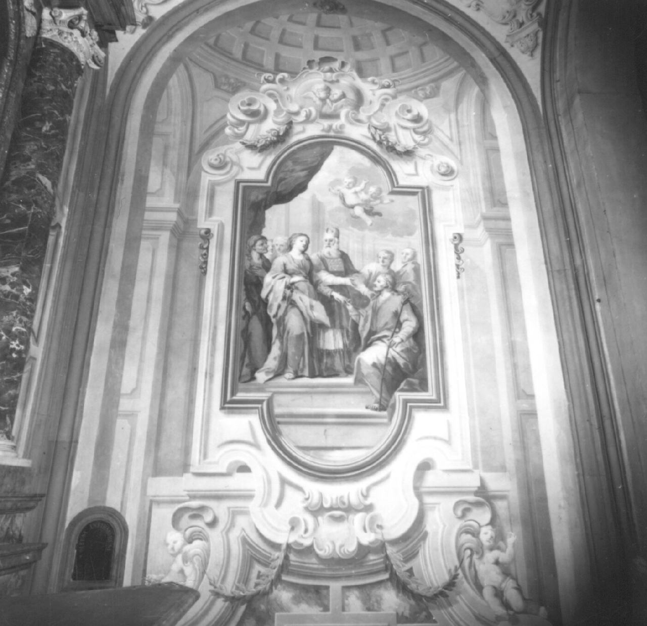 Cornice dipinta e decorazione architettonica con festoni disposti su cartigli e volute; in alto un ovale con due teste di cherubino