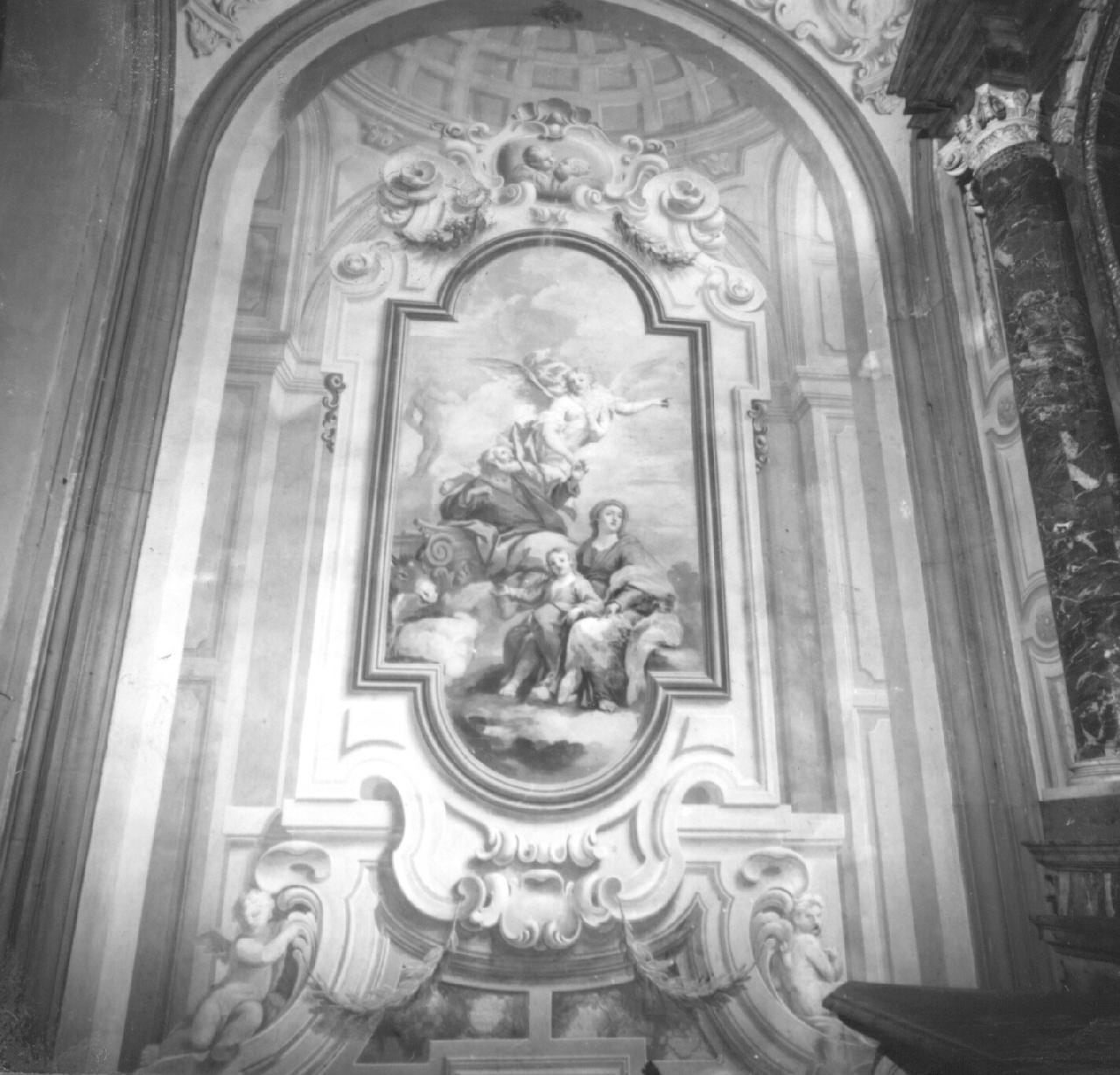 Cornice dipinta e decorazione architettonica con festoni disposti su cartigli e volute; in alto un ovale con due teste di cherubino