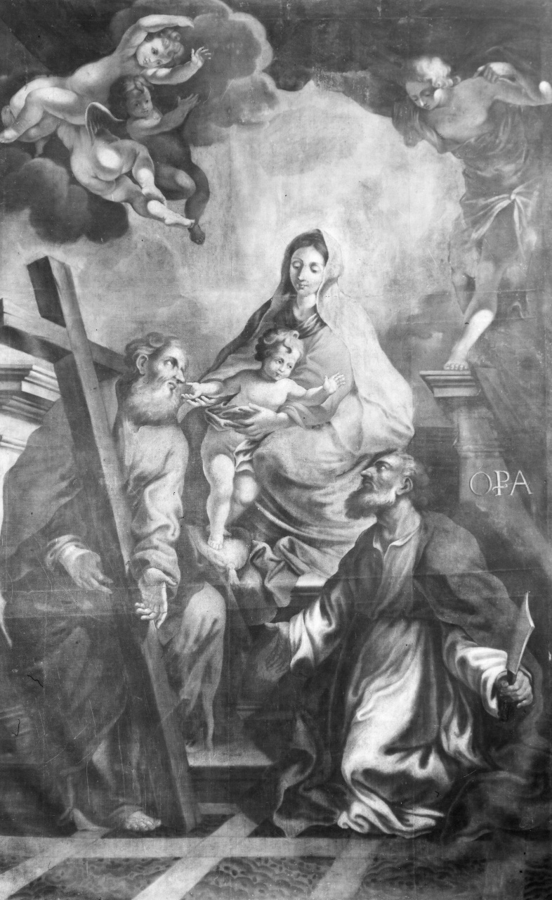 Personaggi: Madonna; Gesù Bambino; San Bartolomeo; Sant'Andrea. Figure: cherubini. Attributi: (San Bartolomeo) croce. Attributi: (Sant'Andrea) spada