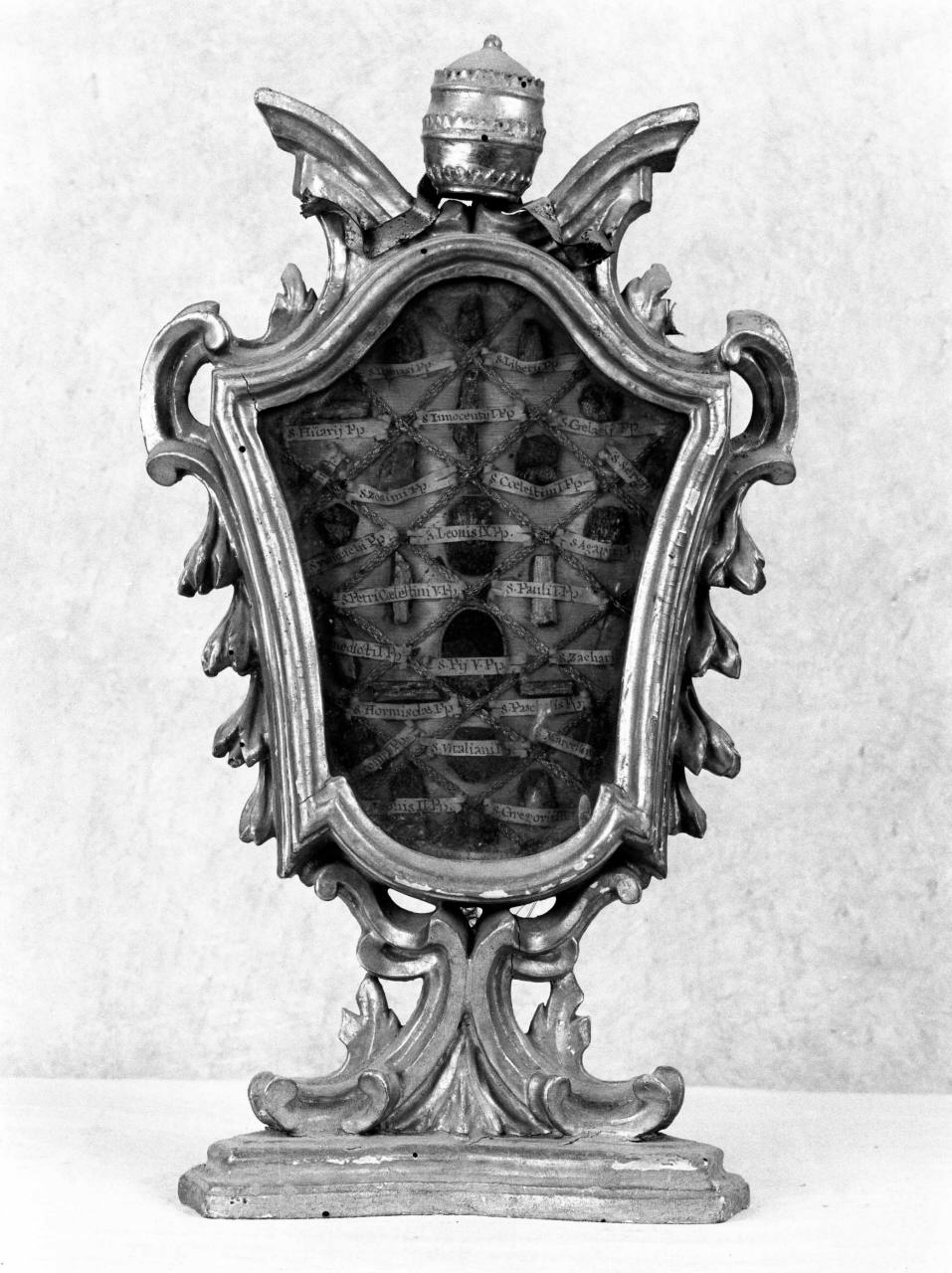 Reliquiario su base trapezoidale, dalla quale si sviluppano due volute, costituenti il fusto, che sorreggono una teca ampia contenete venticinque reliquie di Papi, ciascuna indicata da un cartellino sovrastante. La cornice mistilinea, fornita di due piccole anse a volute, è ornata da quattro foglie sovrammesse. La parte terminale è costituita da una cornice, spezzata e speculare a quella della teca, con al centro una tiara