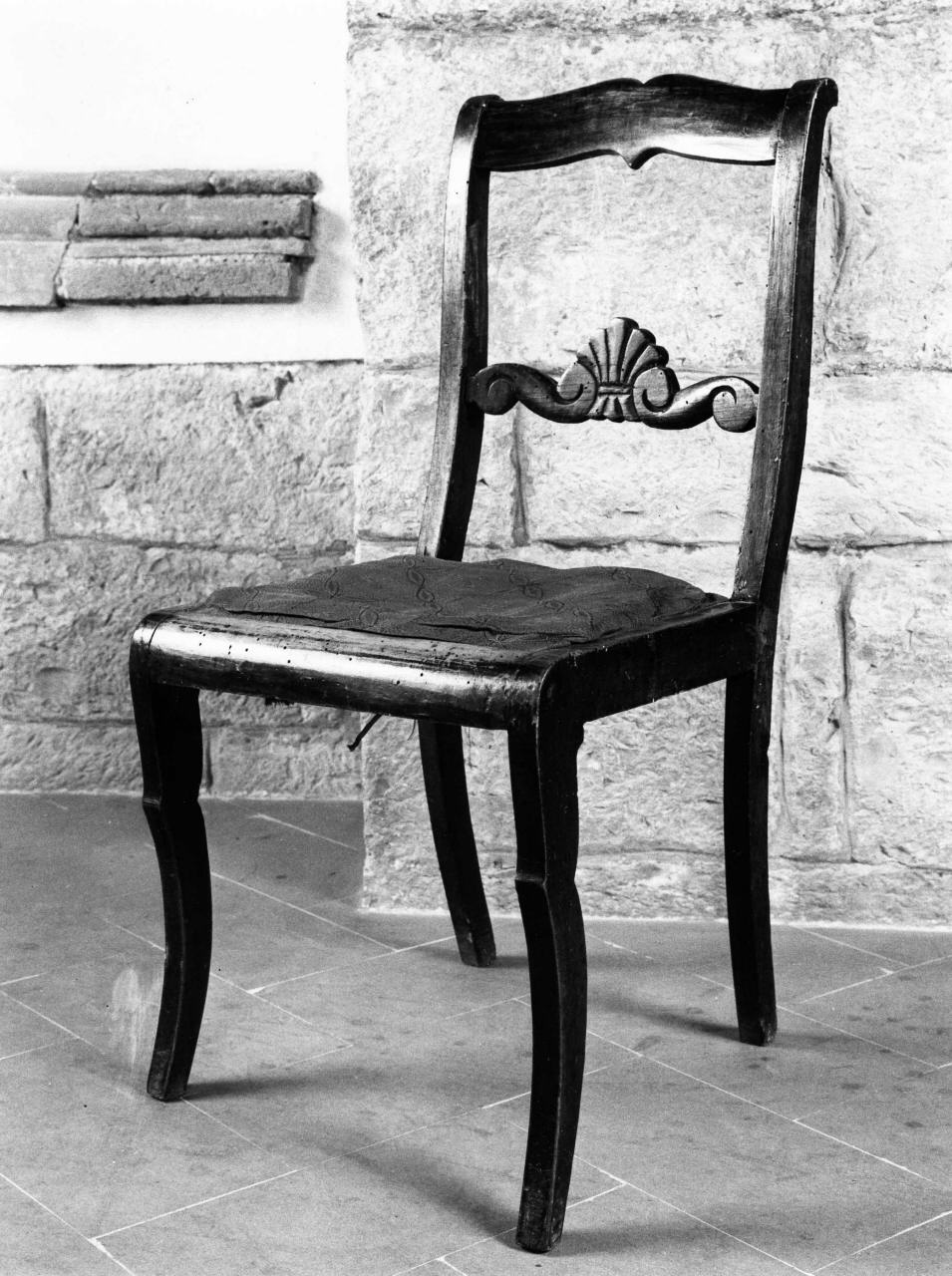Sedia in legno dolce verniciato a noce. Presenta, in alto nella spalliera, una fascia liscia con una doppia e contrapposta sagomatura che, identica, si ripete anche nelle zampe anteriori. La fascia centrale dello schienale è decorata da un motivo intagliato a palmetta inserito tra due doppie volute. Il sedile è ricoperto da stoffa damascata rossa, originale
