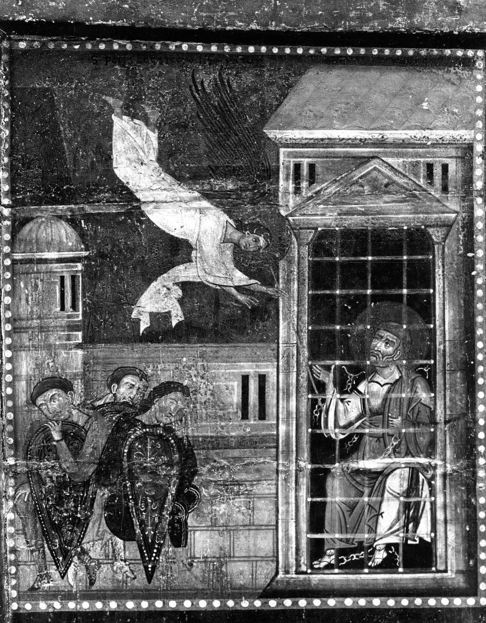 Personaggi: san Pietro. Figure: angelo. Figure maschili: tre guardie. Architetture: prigione; torre; mura. Armi: scudi. Attributi: (San Pietro) aureola. Oggetti: catene