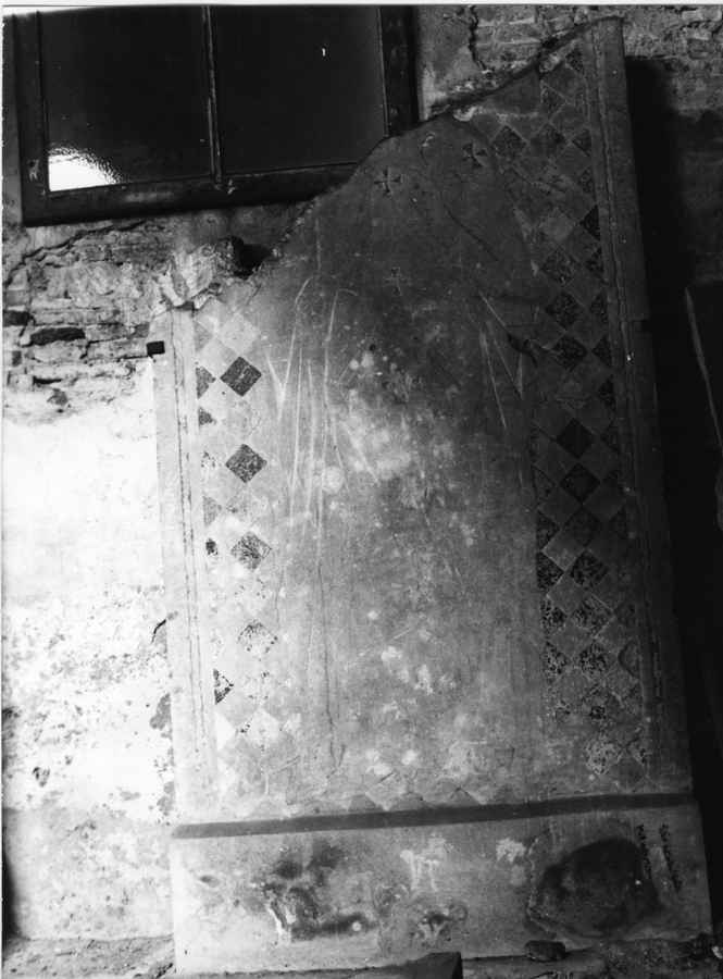 Lastra della tomba di Guglielmo Dulcini, vescovo domenicano di Lucca e precedentemente legato apostolico in Toscana e nelle Fiandre. L'oggetto, giunto in vari frammenti, presenta un fondo a losanghe bianche e verdi sul quale si adagia la figura del vescovo in abiti pontificali. Sono presenti tracce di una policromia precedente lungo i bordi e sul piviale, i due stemmi posti ai lati della figura vescovile risultano illeggibili