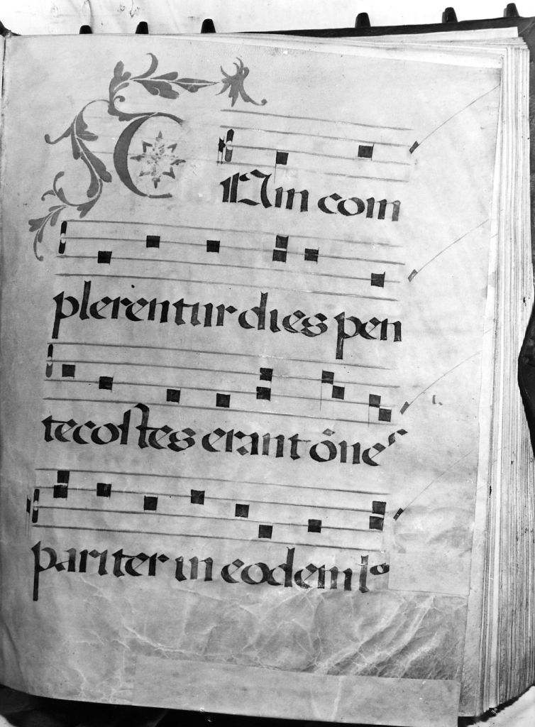 Libro corale graduale e antifonario del tempo di Pentecoste. Legatura in assi coperte di vacchetta; cinwue borchie in ottone per piatto; croce dei Cavalieri dipinta, n. 2 chiudende in cuoio; chiodi di protezione. Ms. in pergamena di carte 147 più aggiunte, lettere iniziali rubricate