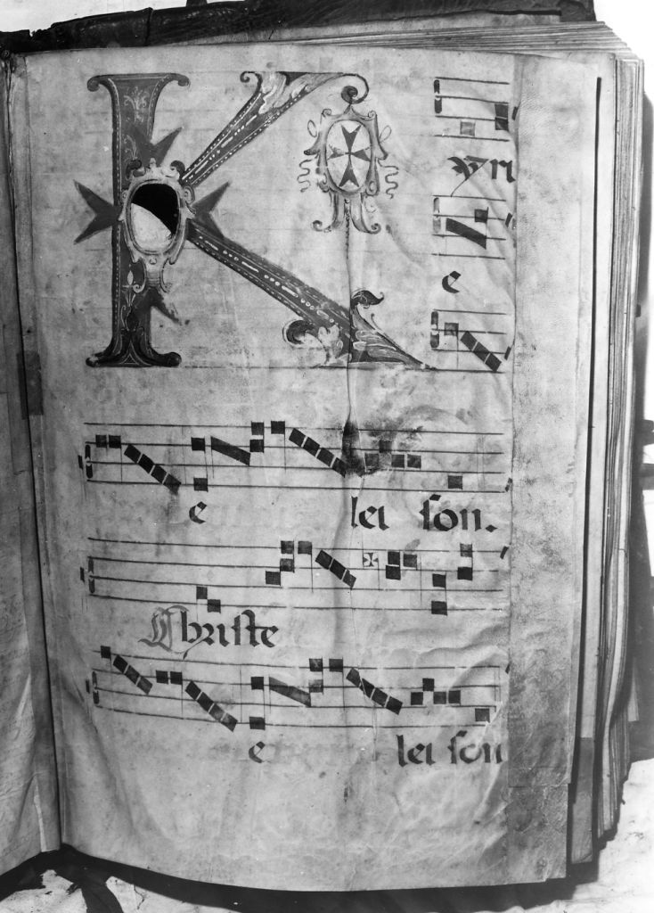 Libro corale graduale, relativo alla parte comune. Legatura in assi coperte di vacchetta; cinque borchie di ottone per piatto; tracce di chiudende; chiodi di protezione; croce dei Cavalieri impressa sulla coperta. Ms. in pergamena di carte 136; capilettera rubricati e miniati, alcuni con stemmi e fregi