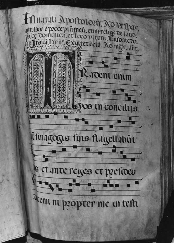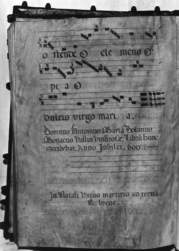 - NOTIZIE STORICO CRITICHE Il corale è opera del monaco vallombrosano Antonio Maria Bolano o Bolani, attivo agli inizi del sec. XVII. Il codice è datato e firmato e appare stilisticamente isolato nel gruppo degli altri corali decorati conservati nella chiesa