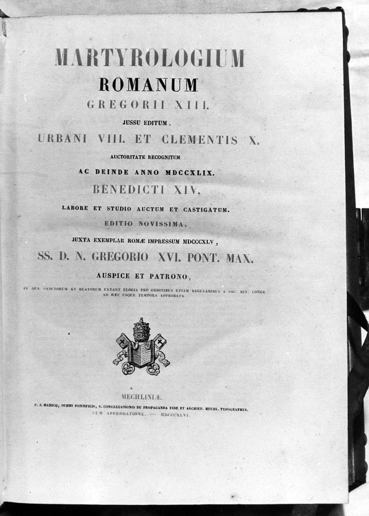 La legatura è in assi coperte di vacchetta. Cinque borchie in ottone, con impresso un fiore di rosa. Al centro del piatto la croce dei Cavalieri; una chiudenda in ottone; costola filettata in oro. Racchiude un volume cartaceo a stampa del martirologio romano. Finalino del frontespizio: triregno, chiavi, Vangelo. Seguono le iscrizioni in latino in lettere capitali. " Martyrologium romanum Gregorii XIII jussu etidum, Urbani VIII et Clementis X auctoritate recognitum ac deinde anno MDCCXLIX Benedicti XIV labore et studio auctum et castigatum editio novissima juxta exemplar Romae impressum MDCCCXLV SS. D. N. Gregorio XVI Pont. Max. auspice et patrono in qua sanctorum et beatorum extant elogia pro ordinibus etiam regularibus a sa. rit. cong. ad heac usque tempora approbata". In basso: "Mechlineae, P.J. Hanicq, summi POntificis, S. Congregationis de Propaganda Fide et Rchiep. Mechl.Typographus. Cum approbatione, MDCCCXLVI"
