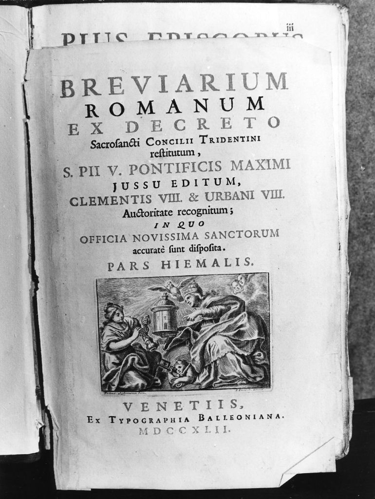Legatura in pelle sottile scura con tracce di filettatura leggera a secco. Racchiude il breviario romano diviso in due volumi, rispettivamente la pars aestiva e la pars hiemalis. Sul frontespizio dei due volumi un' allegoria della Chiesa. Seguono le iscrizioni in latino: "Breviarium romanum ex decreto sacrosanti Concilii Tridentini restitutum, S. Piii V Pontificis Maximi jussu editum Clementis VIII & Urbani VIII auctoritate recognitum". In basso: "Venetiis ex Typographia Balleoniana MDCCXLII"
