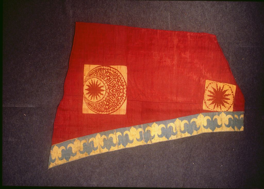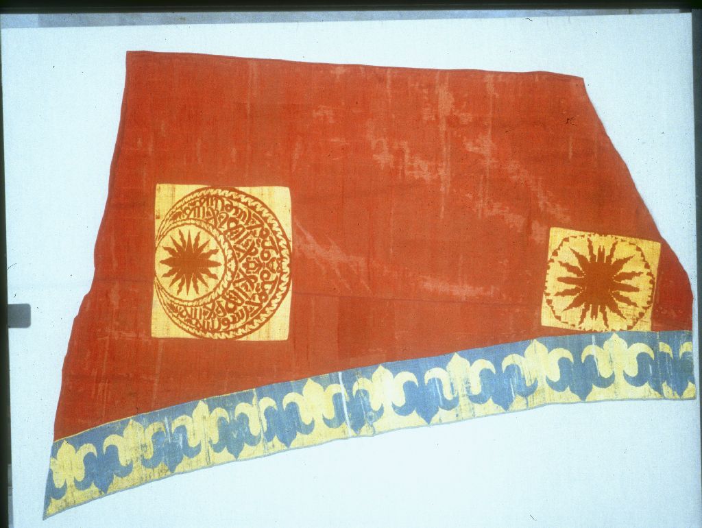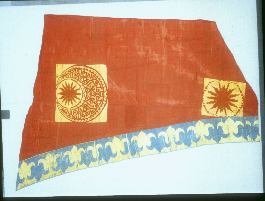 Bandiera di forma trapezoidale, ottenuta dalla giunzione di due pezzi dello stesso tessuto, in tessuto doppio, armatura taffetas, a fondo rosso, con motivi decorativi quadrangolari gialli: in alto, luna crescente con iscrizione araba e stella fiammeggiante rossa, in basso, stella fiammeggiante rossa entro cerchio dentellato. A sinistra, bordo in tessuto doppio, armatura taffetas, giallo e azzurro, con tulipani affrontati ad effetto positivo-negativo