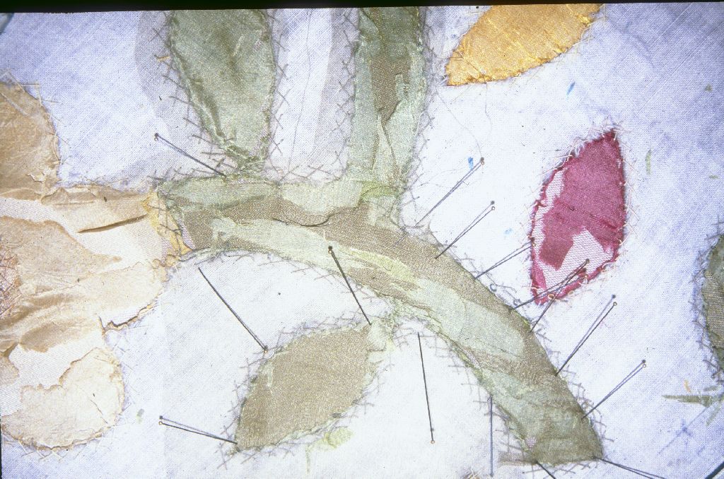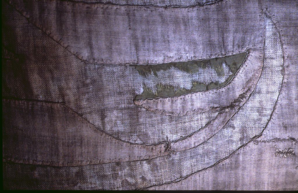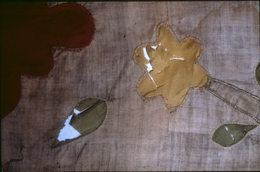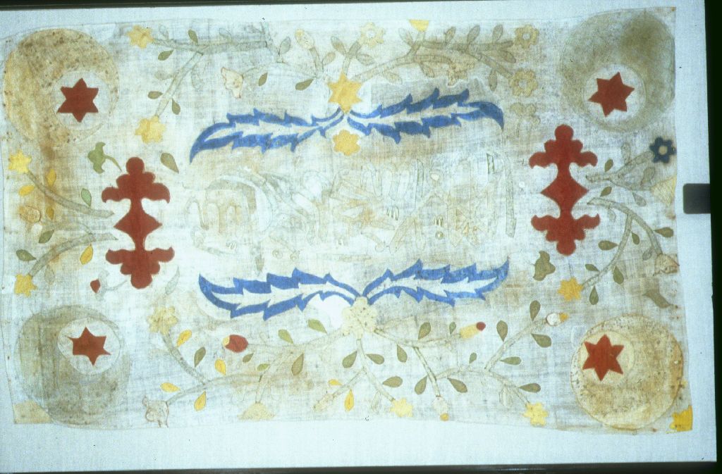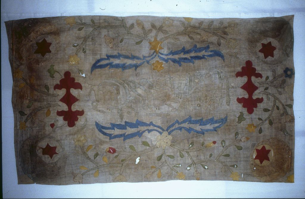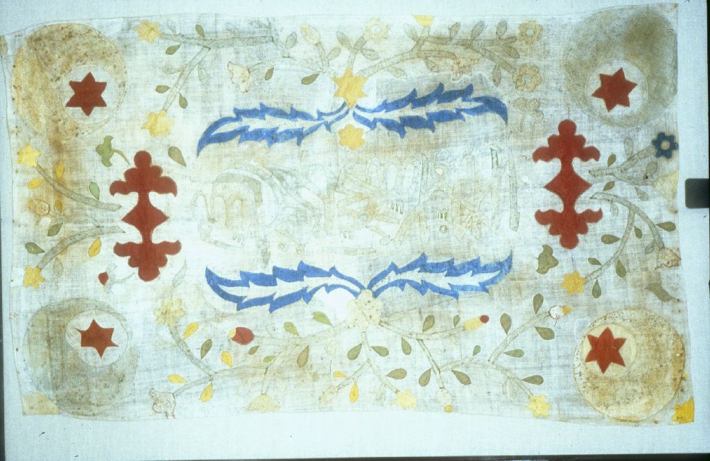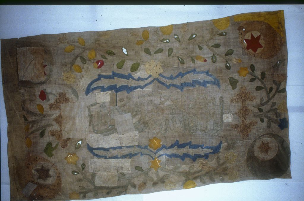 Bandiera di forma rettangolare, ottenuta dalla giustapposizione di tre strisce ini tela di cotone naturale, con alcuni inserti in tela di lino bianco piuttosto rada. La decorazione è a intarsio, con tessuti diversi a contrasto di colore: tela di cotone blu, verdino, giallino, taffetas rosso violaceo, giallo, verde erba. Iscrizione centrale tra coppie di lunghe foglie dentellate, sovrastate da rami stilizzati con foglioline, fiori, boccioli. Nei lati corti l'iscrizione è compresa tra motivi a doppio giglio stilizzato, con losanga centrale. Agli angoli quattro mezzelune, includenti una stella. Nelle cuciture dell'iscrizione, in tela di cotone, restano molti frammenti dei tessuti in seta che la realizzavano.Priva di orli