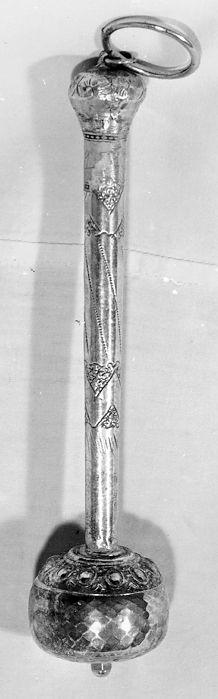 Manico ornato da motivi geometrici nella parte inferiore, con anello terminale. Globo con motivo a ovoli alternati a fregi