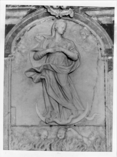 In alto Madonna con i piedi che calpestano serpente sulla falce di luna. In basso anime del purgatorio tra le fiamme