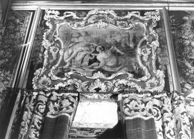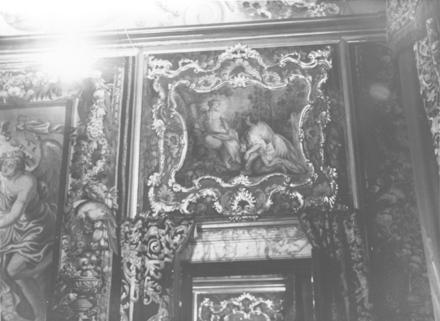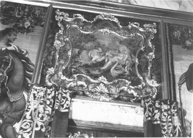 Serie di 5 sovraporte formate da piccoli arazzi delimitati da un duplice ordine di cornici dorate, dalla linea sinuosa e ornate di motivi a rocaille. Gli arazzi raffigurano: 1) Urania e Polimnia, Urania, Musa dell'astronomia e della matematica, è seduta in atto di sostenere un globo; accanto le sta Polimnia (musa del canto e dell'eloquenza). 2) Clio (musa della Fama) nell'atto di porgere l'alloro a Melpomene (Musa della poesia tragica), su uno sfondo di rovine immerse nella vegetazione. 3) Calliope (Musa della musica) inginocchiata in atto di scriver musica dinanzi ad Apollo che regge la lira. 4) Euterpe ed Erato con strumenti musicali nei pressi di un laghetto con cigni. 5) Talia (Musa del teatro) che regge la maschera e Tersicore (Musa della danza) che regge la lira: sullo sfondo una fontana con mascherone e il paesaggio alberato