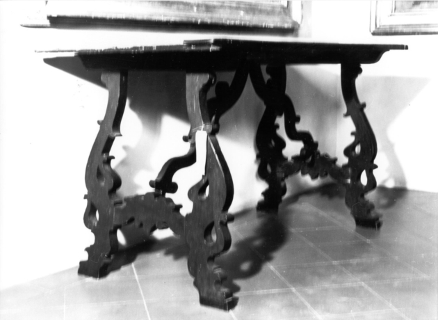 L'oggetto è caratterizzato dalla presenza di due gambe a lira unite al centro da due traverse oblique; ricca è la gamma di motivi sagomati nella parte di sostegno, mentre il piano è impiallacciato a specchiature geometriche racchiudenti rosoni in avorio