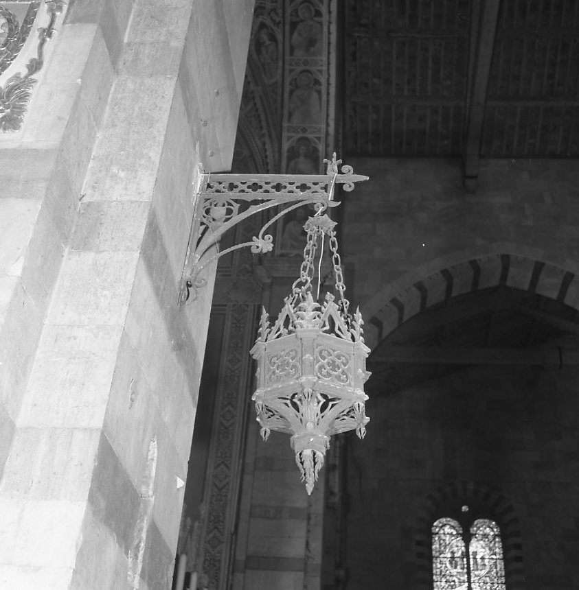 Lampione in ferro battuto a pianta esagonale. Sulle facce dell'esagono troviamo motivi decorativi quadrilobati alternati a colonnine; il tutto è modanato alla sommità. Ogni faccia è sormontata da una cuspide trilobata e gattonata alternata a palmette. La zona inferiore ha il medesimo motivo decorativo lobato incavato che va a restringersi su un dado sempre esagonale da cui scende un elemento vegetale. I lampioni sono appesi al muro mediante un lungo braccio ad angolo retto anch'esso decorato