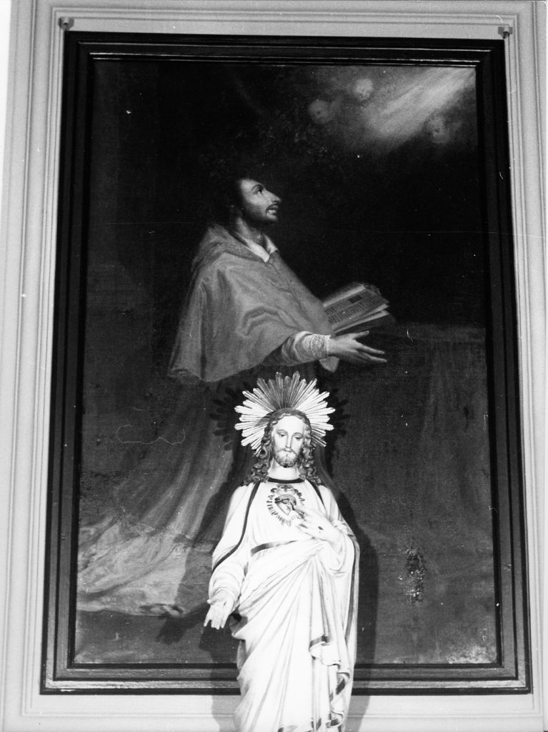 Dipinto raffigurante S. Carlo Borromeo in estasi inginocchiato con un messale aperto in mano. Il santo è vestito con l'abito cardinalizio verde scuro e rosso e i suoi occhi fissano la luce divina