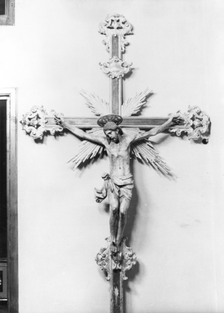 Bracci rossi, terminali a volute vegetali perlinate includenti cartella sagomata a giorno con motivo fogliaceo centrale, cartiglio a volute. Cristo con perizoma bianco e bordo dorato