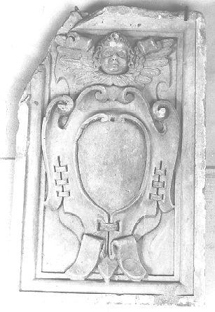 Specchio marmoreo di tomba con cornici includenti uno scudo gentilizio sovrastato da un cherubino. Nel lato sinistro dello specchio manca l'angolo in alto