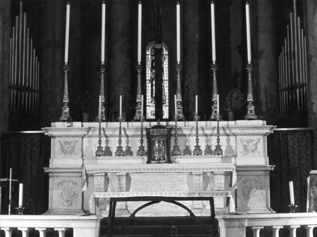 Mensa sorretta da quattro volute scanalate con foglia d'acanto terminale, paliottocon croce raggiata centrale tra foglie d'acanto, volute e fiori, ai lati simbolicristiani ripetuti nei pilastri laterali con ghirlande di fiori includenti duepalme incrociate nella parte superiore. Gradino a doppio ripiano con cornicia ovoli e a foglie d'acanto. Sulle facce laterali due festoni di frutta tenutida nastri svolazzanti. Colore grigio venato