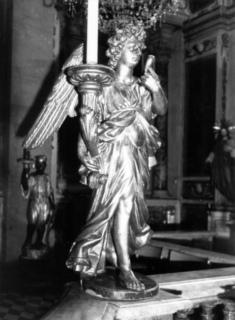 Gli angeli sono raffigurati in movimento con abito svolazzante. Con una mano reggono una cornucopia su cui si innesta il cero