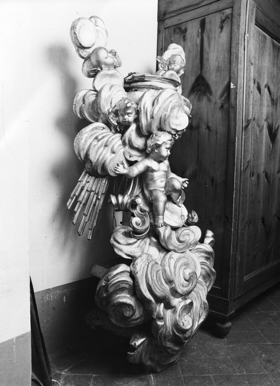 Residenza in legno intagliato argentato e dorato con decorazioni a forma di nembi e raggera e testine alate. Nella parte centrale è raffigurato un angioletto nudo, a figura intera