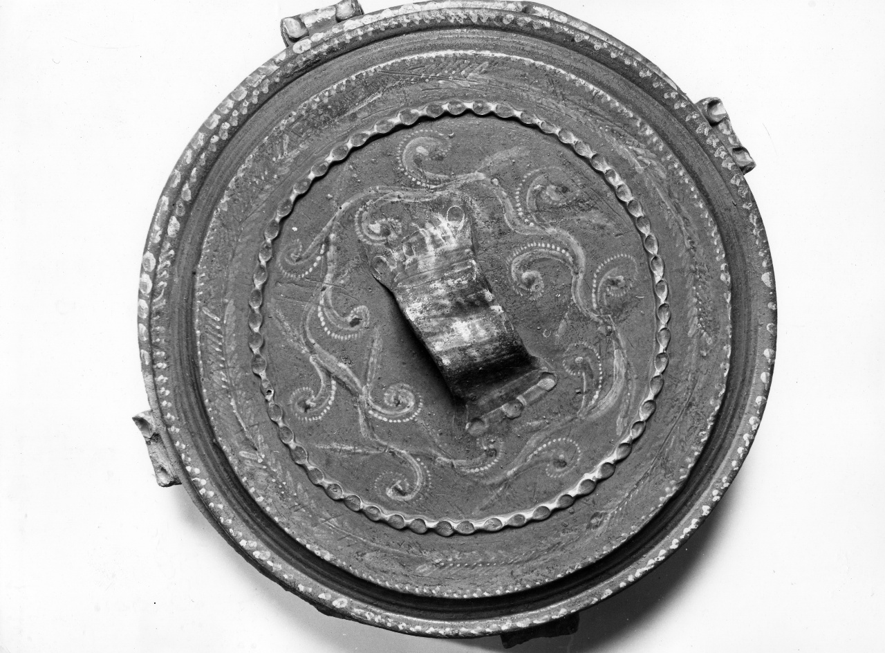 Grande catino piano, con bordo a becco decorato da brevi tratti a raggiera, gialli, e 4 manici, in argilla. La decorazione è varia: motivo di croce al centro, e volute vegetali tutte intorno, gialle e verdi. Il coperchio presenta un grosso manico ondulato al centro e un motivo di cordonature a rilievo vicino al bordo; anche qui si ripetono gli stessi motivi ornamentali con gli stessi colori. Non ci sono ne marchi ne iscrizioni