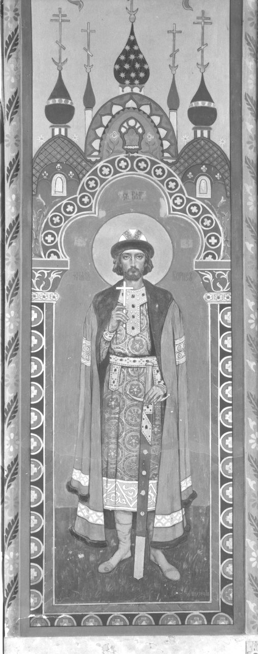 - NOTIZIE STORICO CRITICHE San Boris, principe di Murome figlio di San Vladimir il Grande (principe di Kiev, che fece convertire al cristianesimo la Russia), fu assassinato dallo zio insieme al fratello Gleb (cfr. scheda 0900073219) ed ambedue sono stati santificati. L'autore, che eseguì questa figura gratuitamente, aveva dipinto anche le due scene sulle pareti terminali del transetto (schede 0900073212, 0900073215) e gli arconi centrali (schede 0900073201-0900073204)