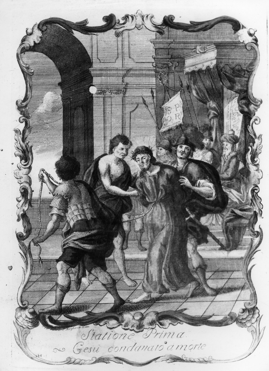- NOTIZIE STORICO CRITICHE Le stampe di non grande qualità, mostrano composizioni affollate e personaggi dai gesti ampi e concitati, di lontana origine cinque-seicentesca. Gli edifici nello sfondo sono a volte classici, a volte medievali, in un caso (foto n. 275079) hanno caratteri stilistici settecenteschi. La serie può collocarsi alla fine del XVIII secolo o all'inizio del XIX. Nella chiesa di S. Michele a Vellano esiste una serie identica, (cfr. scheda ad locum)